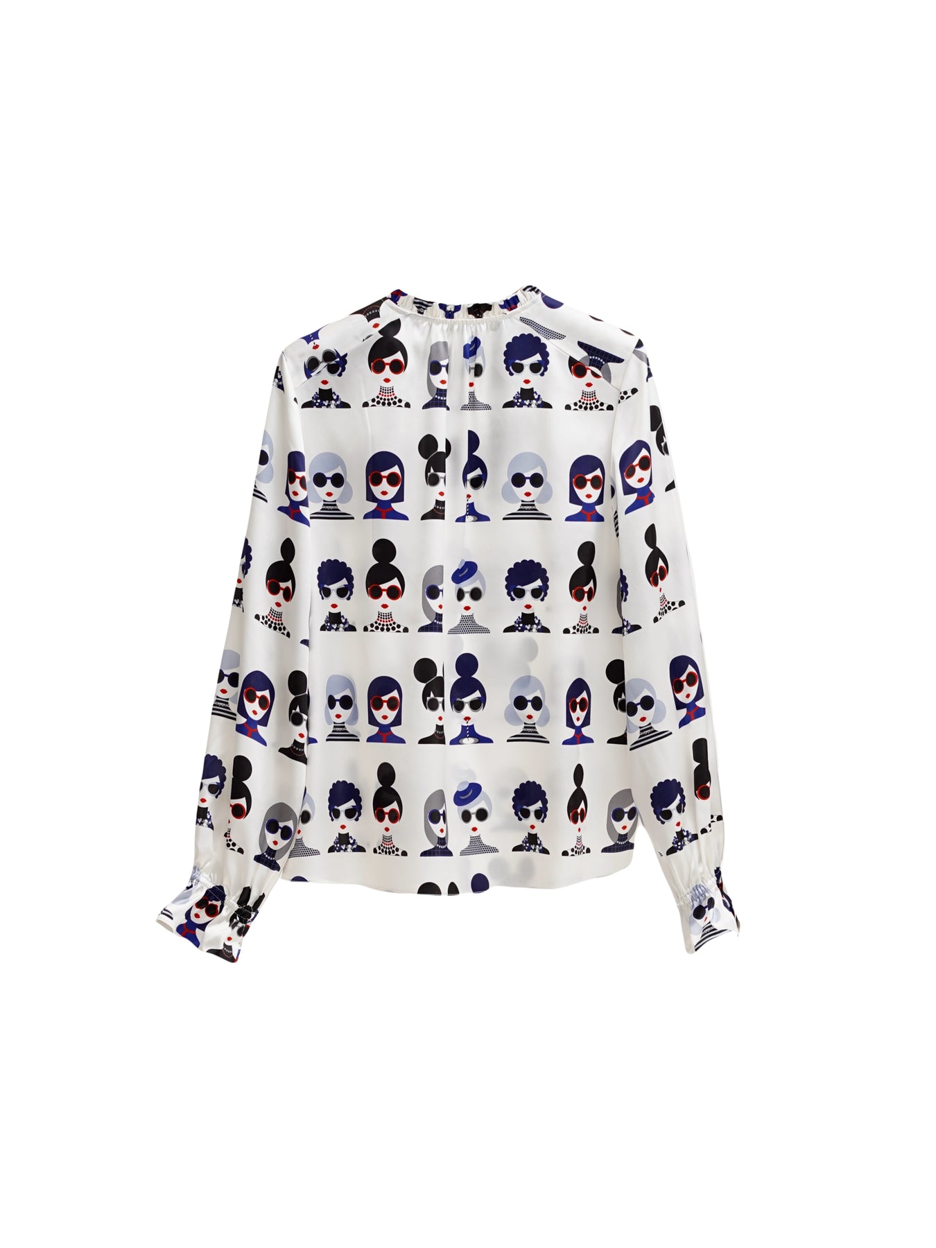 Bluse Herzensangelegenheit. Die coole Bluse von Herzensangelegenheit hat ein Muster, auf dem viele verschiedene Gesichter zu sehen sind. Die Bluse ist locker geschnitten und hat einen V-Ausschnitt, der am Ende mit zwei Knöpfen zugemacht werden kann. Sie ist abgerundet am Saum und die hintere Seite ist länger geschnitten. Auf der Rückseite ist eine Kellerfalte. Die Bluse hat auch Manschetten mit zwei Knöpfen. Sie ist aus einer weichen, leichten Ware und fällt größengerecht aus. Die Bluse lässt sich vielseitig kombinieren und kann durch ihren außergewöhnlichen Look passend zu jeder Hose gestylt werden, um ein einzigartiges Outfit zu kreieren.