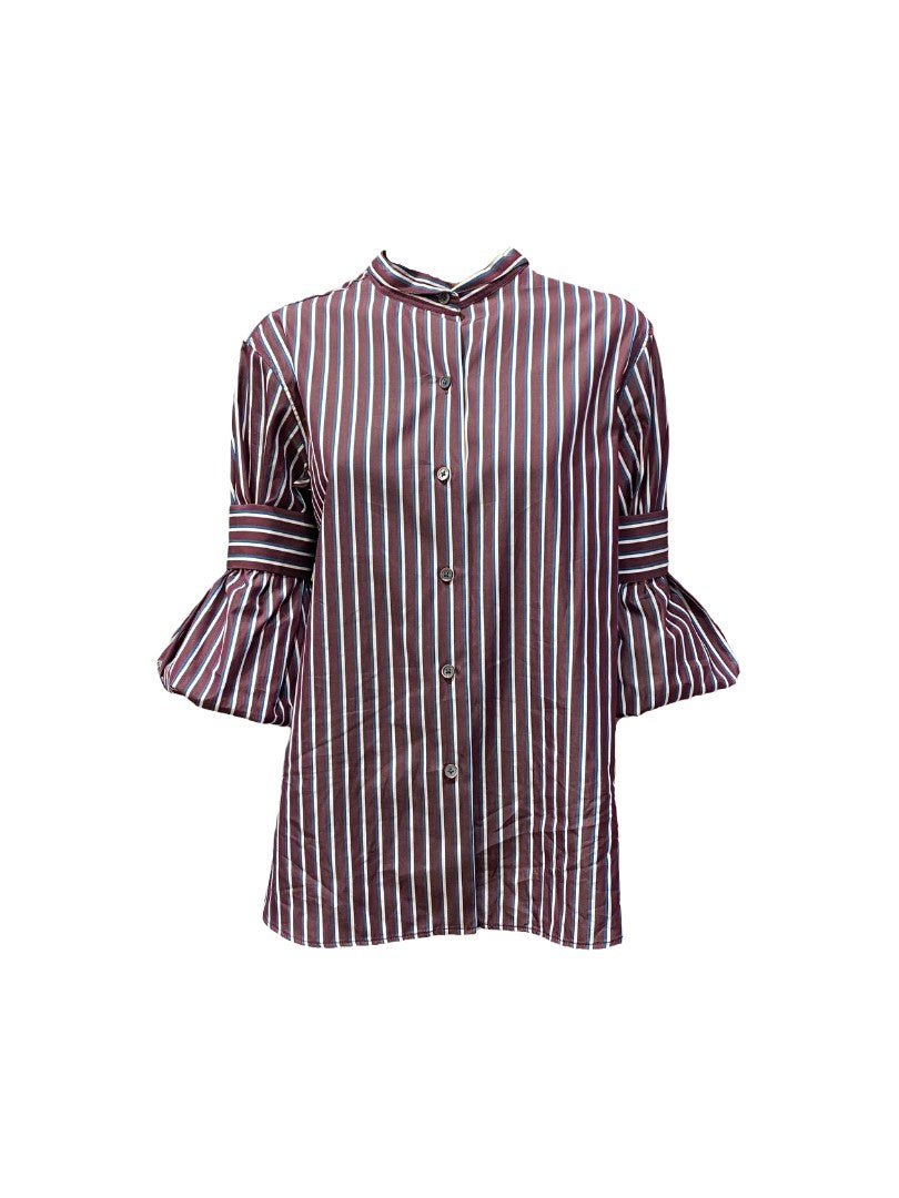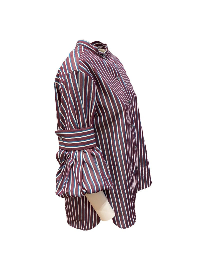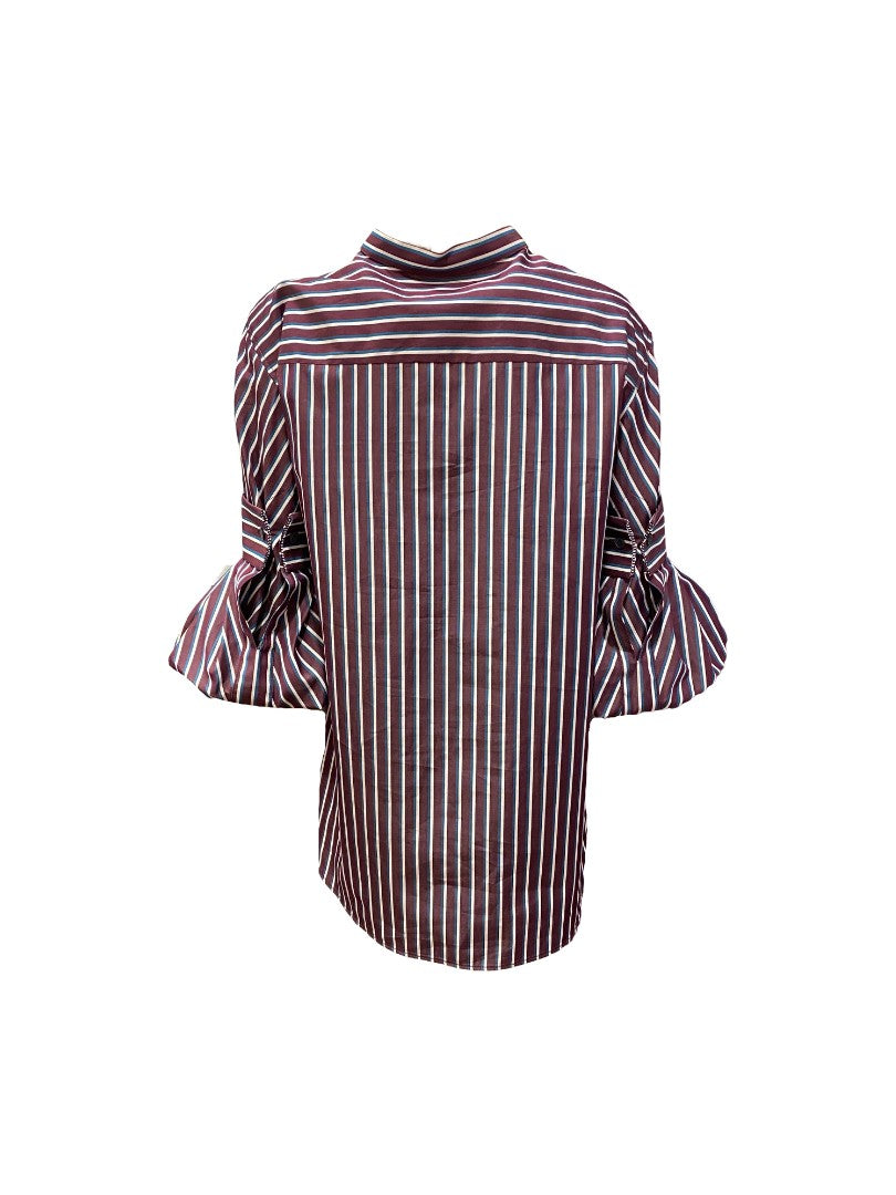 Hemd Odeeh. Dieses Hemd hat ein sportlich-elegantes Streifenmuster. Es verfügt über einen durchgehenden Knopfverschluss und einen kleinen Kragen. Es ist hinten länger geschnitten als vorne und hat große Manschetten. Das Hemd sticht durch seine besonderen Ärmel hervor, die sich in einem Ballon-Look hochkrämpeln lassen. Es kann aber genauso gut auch mit langen Ärmeln getragen werden. Es fällt größengerecht aus und ist perfekt für einen sportlichen Look mit Jeans und Jacke.