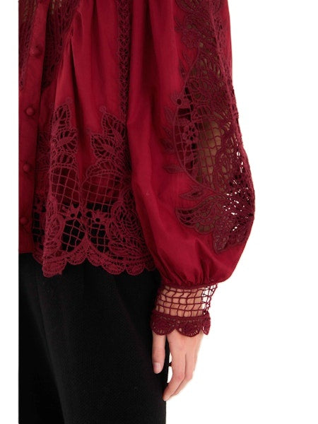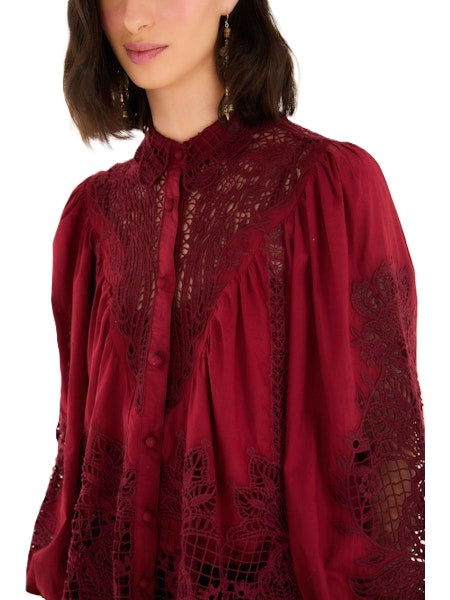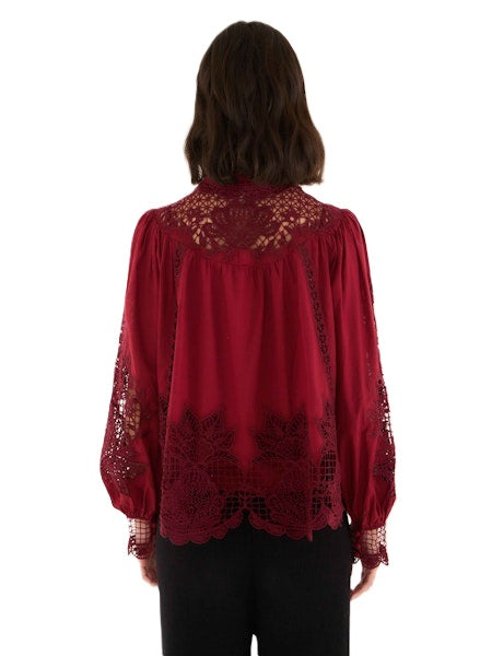 Bluse Farm Rio Berry Garden Guipure Blouse. Die Bluse von Farm Rio begeistert mit ihrer Lochstickerei und Lace Details. Sie hat einen Hemdkragen, eine Knopfleiste und Ballonärmel. Die Manschetten aus Spitze und die wunderschöne beerige Farbe machen die Bluse zu einem besonderen und eleganten Statement-Piece. Die Bluse fällt größengerecht aus und ist das perfekte It-Piece für den Herbst.