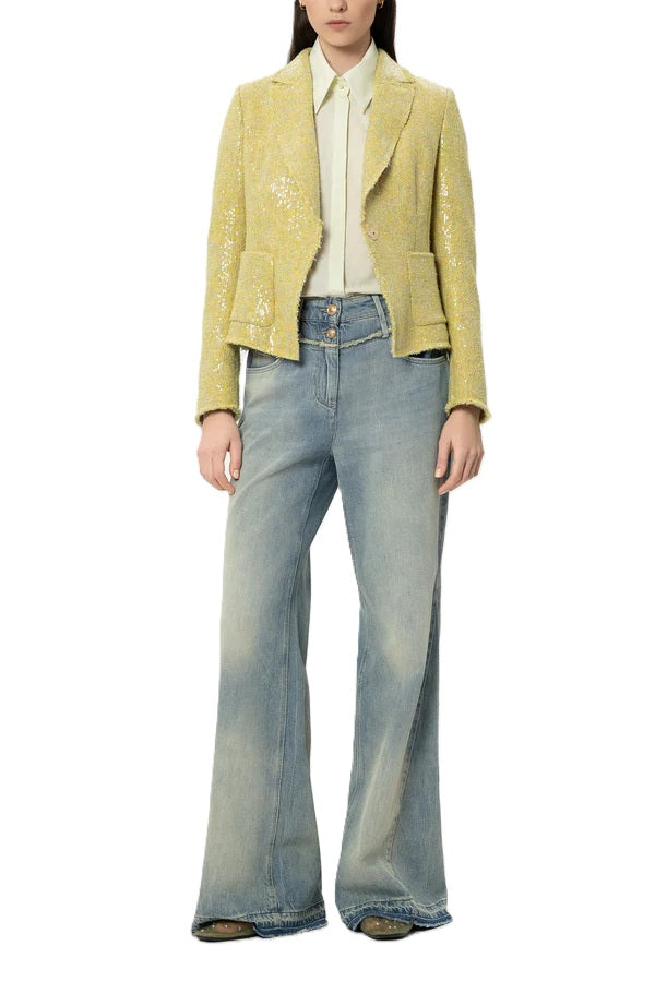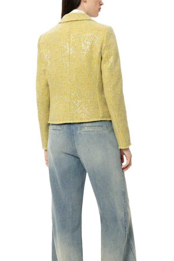 Jacke Luisa Cerano. Cooler Blazer in gelb mit schimmernden transparenten Pailletten. Der Blazer hat eine klassische Form und einen Reverskragen. Zusätzlich aufgesetzte Taschen und einen offenen Saum. Dieser lässt den Blazer sehr modern aussehen. Der Blazer ist aus sommerlichem Tweed und figurbetont geschnitten. Er hat einen Druckknopfverschluss und ist vollständig gefüttert. Wir haben auch die passende Bluse in gelb dazu. Zusammen mit einer coolen Jeans ist der Look für den Sommer perfekt.