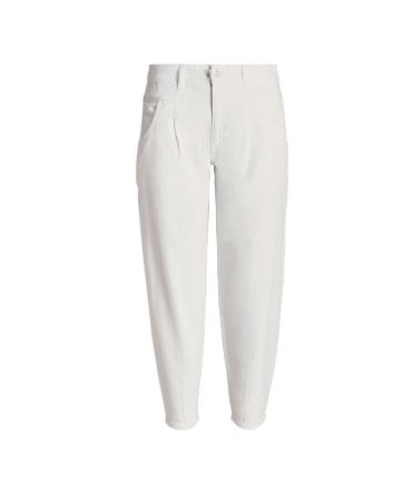 Hose PNTS 05_THE O SHAPE. Leichte Hose aus reiner Baumwolle in ecru. Die Hose hat Bundfalten und ist leicht O-förmig geschnitten. Sie hat ein verkürztes Bein und einen Knopf und Zip zum Verschließen. Die Ware ist perfekt für die wärmeren Tage. Die Hose fällt größengerecht aus und kann mit allen Oberteilen getragen werden.