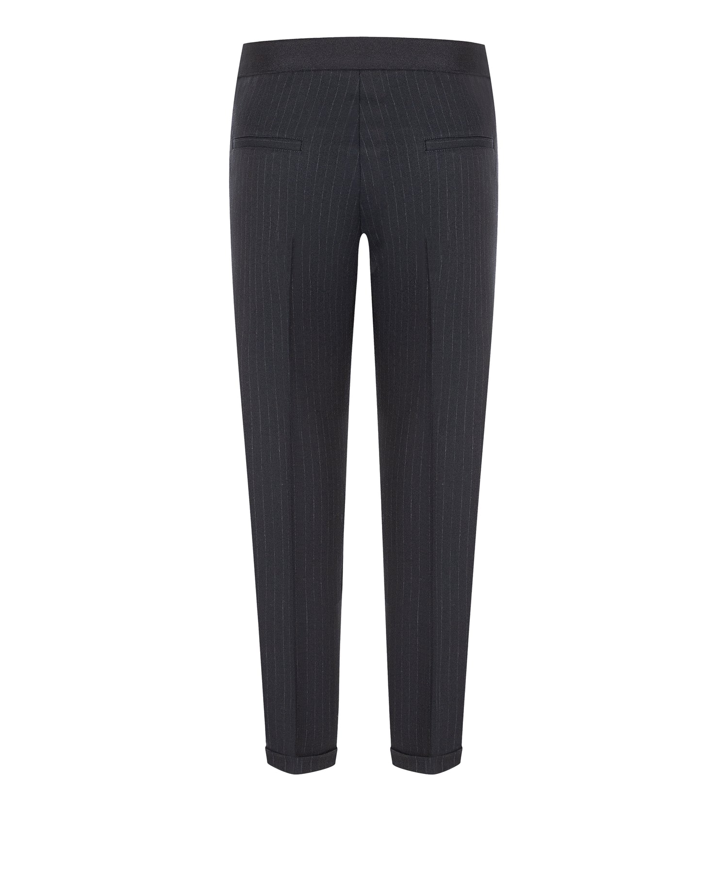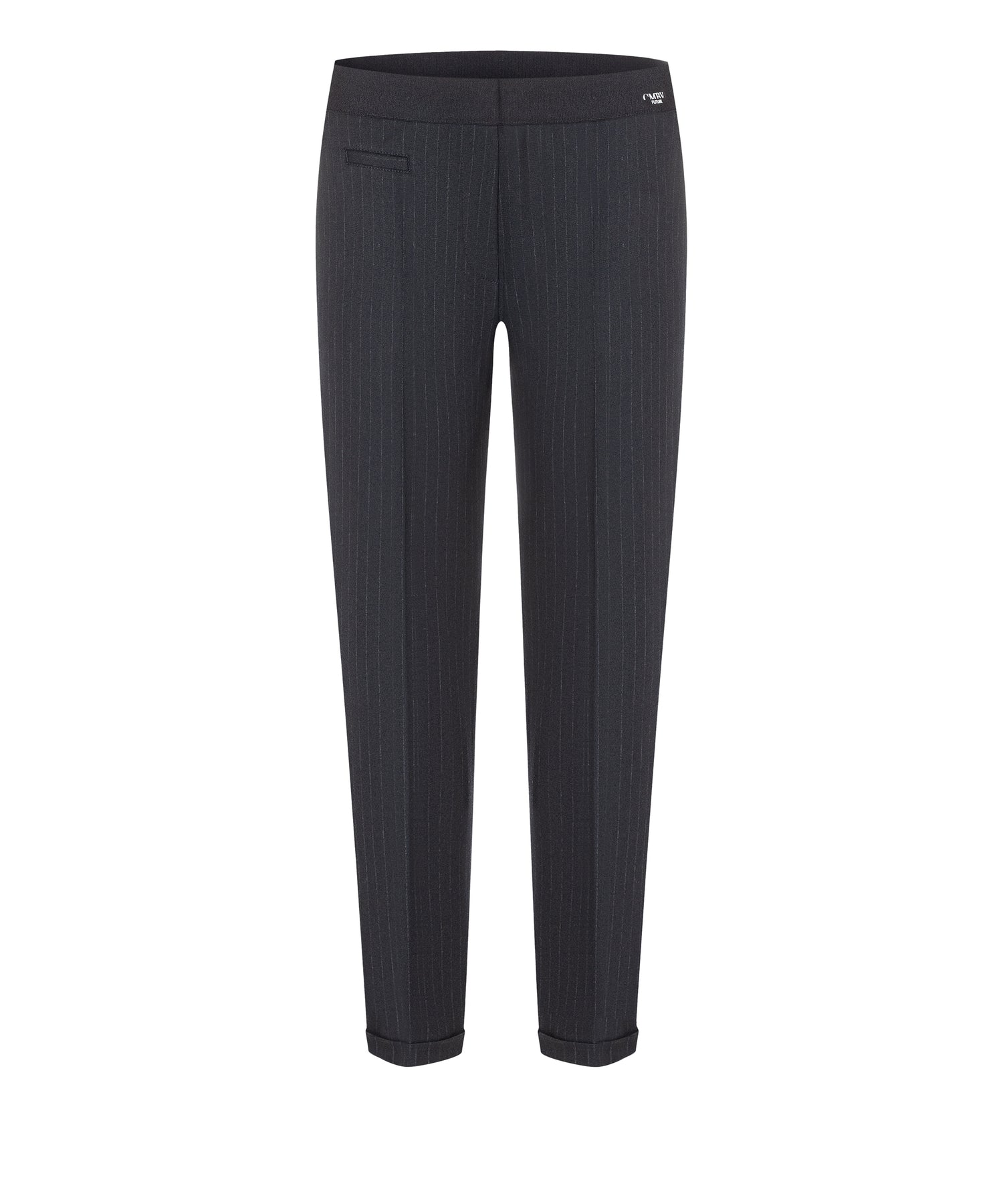 Hose Cambio Kim. Lässige Nadelstreifenhose mit Gummibund und seitlichen Eingriffstaschen. Die Hose ist schmal verlaufend und hat einen kleinen Aufschlag am Saum. Man kann sie sportlich, aber auch elegant kombinieren und passt zu allen Oberteilen. Sie fällt größengerecht aus und ist eine schön wärmende Hose für die kälteren Tage.