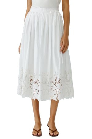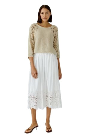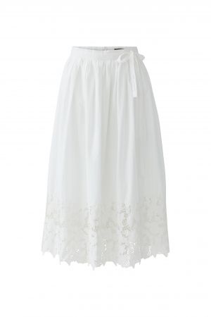 Rock Oui. Super schöner weißer Rock mit Reißverschluss auf der Rückseite. Er hat noch ein zusätzliches Zierband, womit man eine Schleife binden kann. Der Rock ist am Bund in leichte Falten gelegt und am Saum hat er eine wunderschöne Lochstickerei. Der Rock ist oben unterfüttert und am Saum scheint die Haut durch. Der perfekte Rock für den Sommer. Er fällt größengerecht aus und kann mit vielen sommerlichen Shirts kombiniert werden.