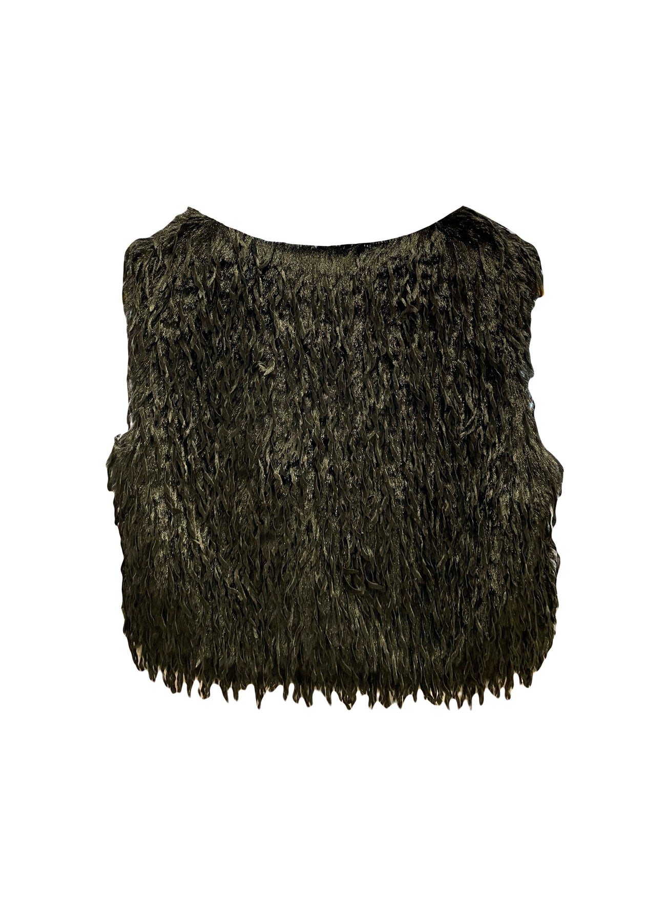 Weste Milestone Michelle. Die coole Weste von Milestone aus Kunstpelz im Federlook. Sie ist kurz geschnitten, kragenlos und mit V-Ausschnitt. Außerdem hat sie versteckte Eingriffstaschen in der Teilungsnaht. Die Weste wird mit stoffbezogenem Hakenverschluss in der vorderen Mitte geschlossen. Die innere Seite der Weste ist aus Satin, der sich angenehm beim Tragen anfühlt. Die Weste fällt größengerecht aus, man kann aber eine Nummer größer nehmen wegen der Länge. Sie kann über allen Blusen oder Pullis getragen werden, um einen coolen Look zu vervollständigen.