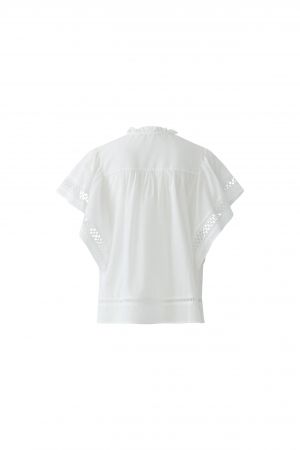 Bluse Oui. Romantische Bluse in weiß mit Lochstickereien und Stehkragen mit kleinen Falten. Die Bluse kann am Kragen mit zwei Bändern gebunden werden. Die Ärmel sind weit und Trapezförmig, welche als Volants an den Seiten runterfließen. Die Bluse hat einen gerade Form und fällt größengerecht aus. Man kann sie super schön zur Jeans stylen.