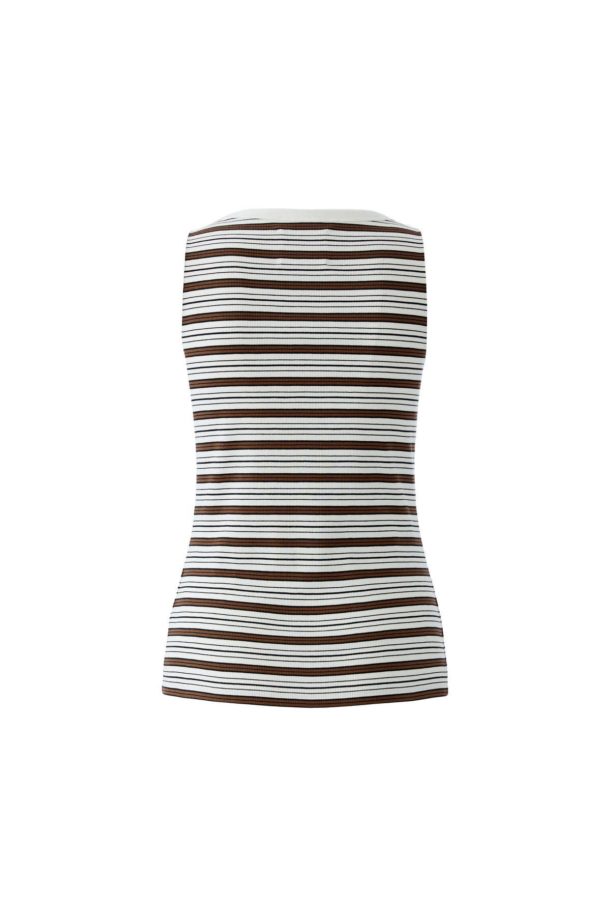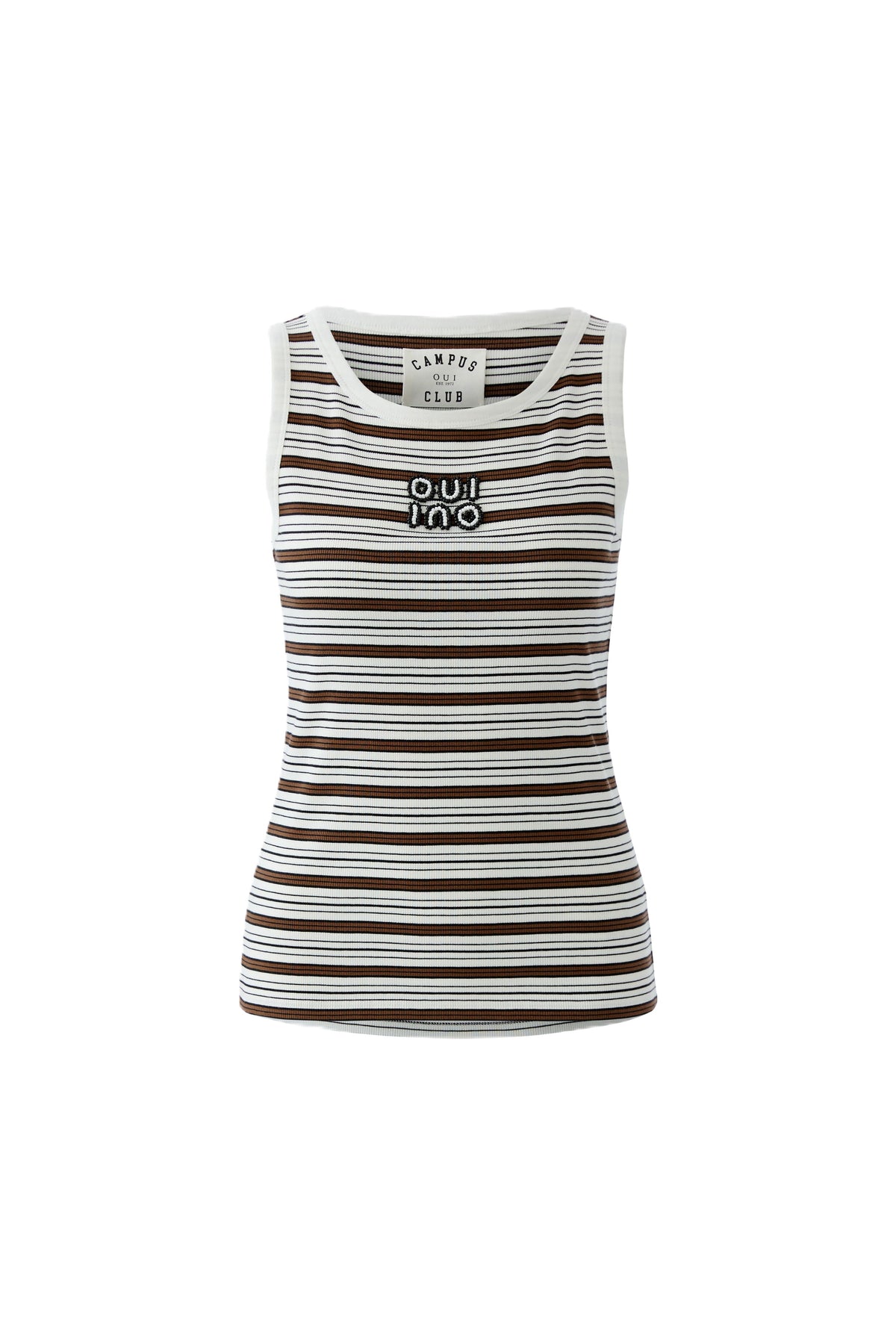 Top Oui. Das ärmellose Ripptop besticht durch seinen klassischen Rundhalsausschnitt und ein modernes Streifenmuster. Ein besonderes Highlight ist das edle Oui-Logo aus Perlen auf der Brust. Es fällt der Größe gerecht aus und ist ideal für wärmere Tage.