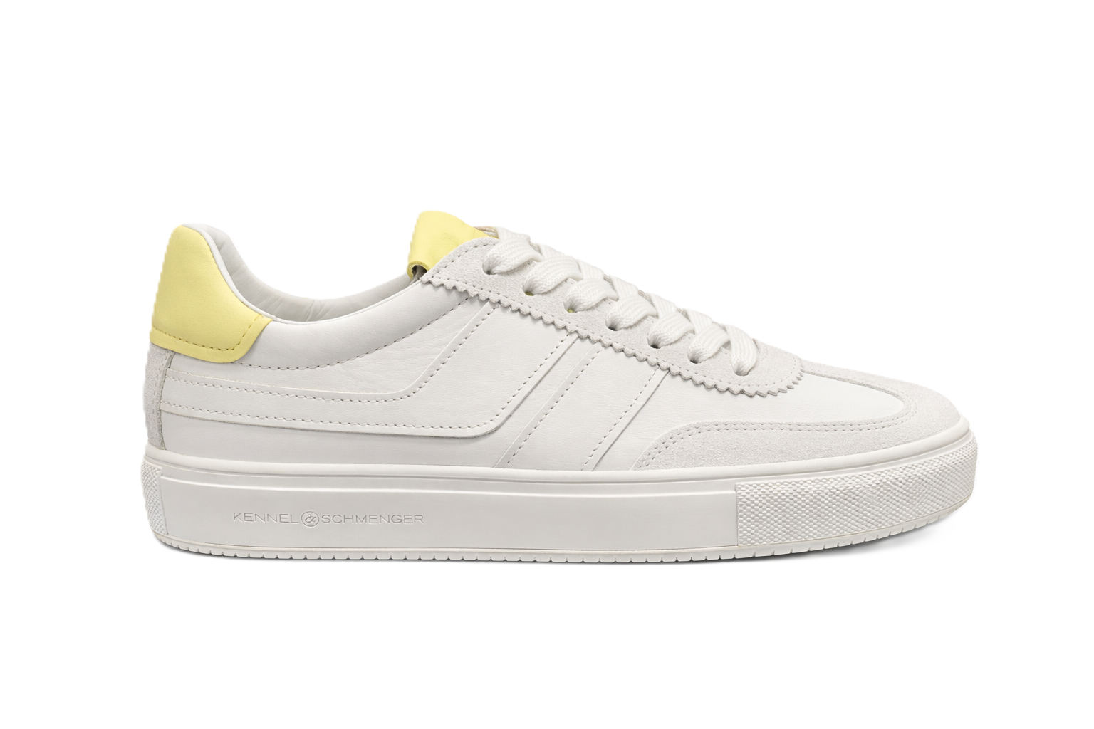 Sneaker Kennel&Schmenger LENI. Ein moderner Sneaker mit femininem Touch: Weißes Glattleder, zarte Gelbe-Akzente und dezente Veloursdetails verleihen diesem Modell eine frische, elegante Leichtigkeit. Die klare Linienführung sorgt für einen sportlich-cleanen Look, während die gepolsterte Fersenkappe für Komfort bei jedem Schritt steht. Ein vielseitiger Begleiter, der Alltagsoutfits genauso stilvoll ergänzt wie minimalistische Fashion-Looks. Auf der Rückseite ist das Leder zart gelb. Dies ergibt einen schönen Kontrast zum weißen Leder. Der Sneaker fällt größengerecht aus und passt zu sehr vielen Sommerlooks.