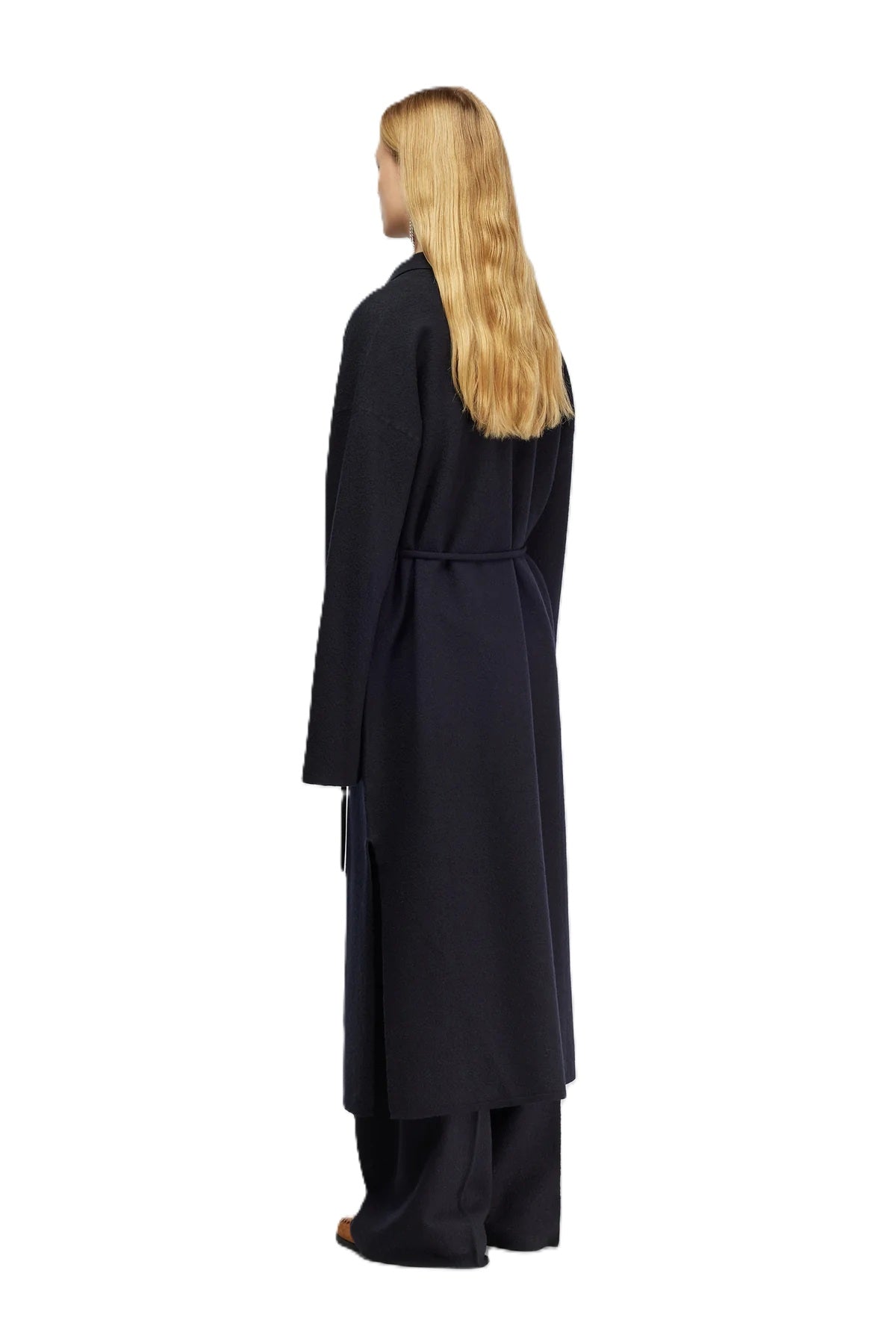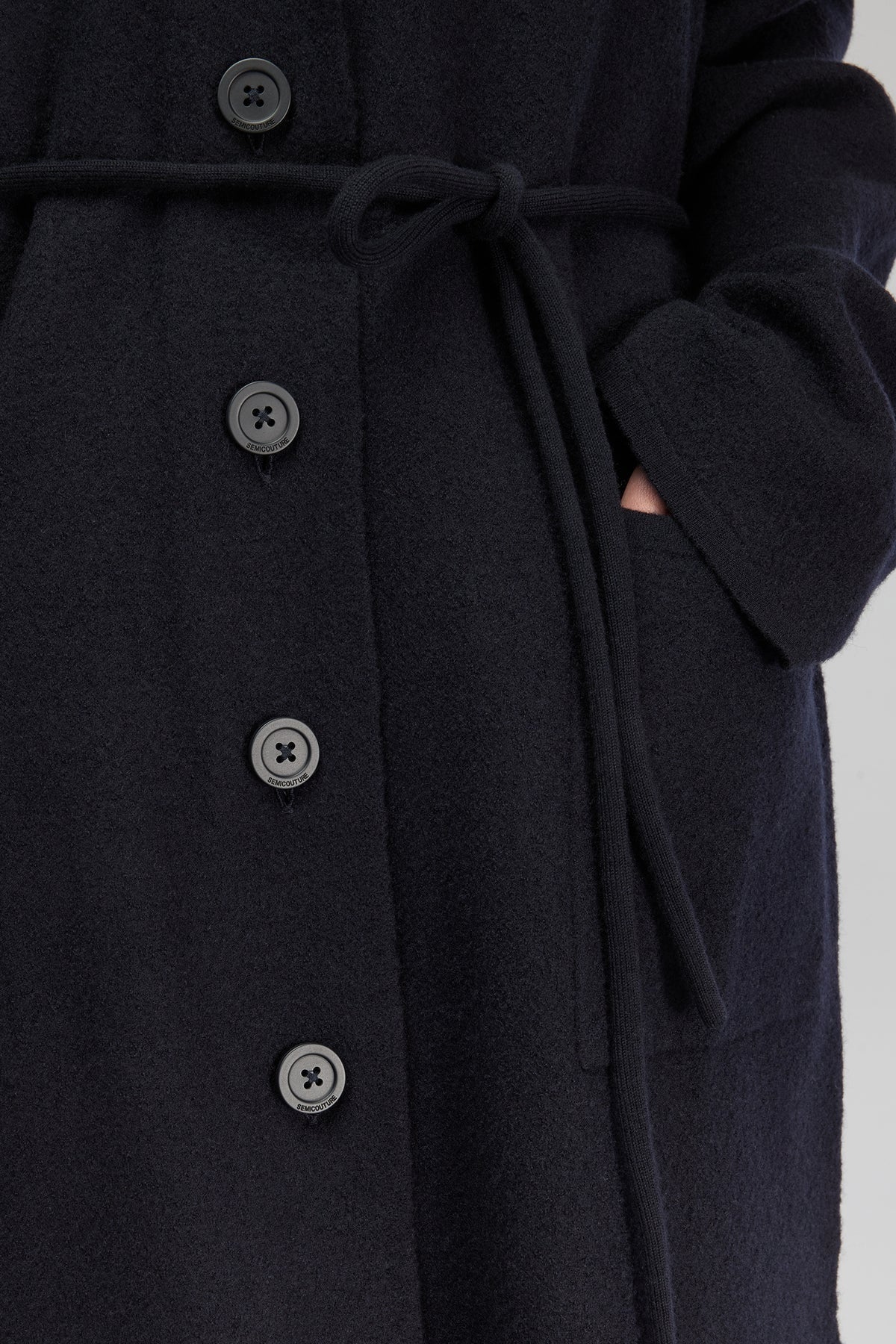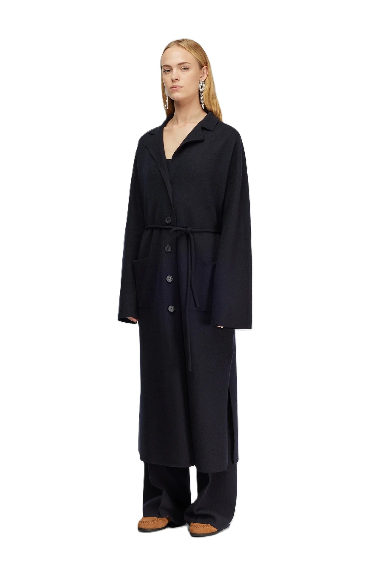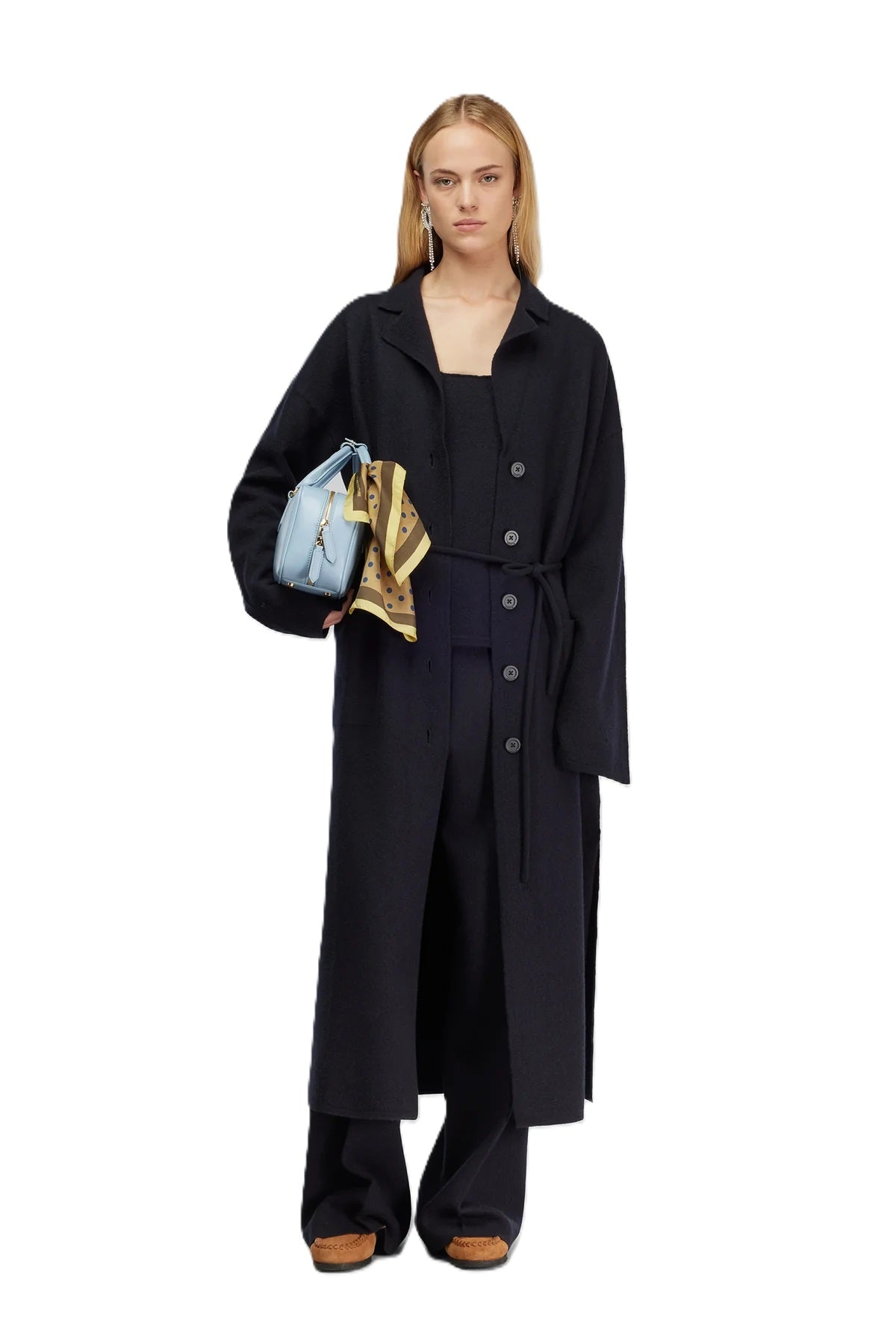 Strickweste Semicouture Andrea. Die wunderschöne Strickweste von Semicouture in dunkelblau. Die Weste hat einen Reverskragen und zwei Stecktaschen. Sie wird mit Knöpfen und mit einem Bindegürtel geschlossen. Die Strickweste hat eine Midi-Länge und fällt größengerecht aus. Am Saum hat sie kleine seitliche Schlitze. Man kann sie gut kombinieren, egal ob für ein Arbeitsoutfit oder für einen stilvollen Freizeitlook.