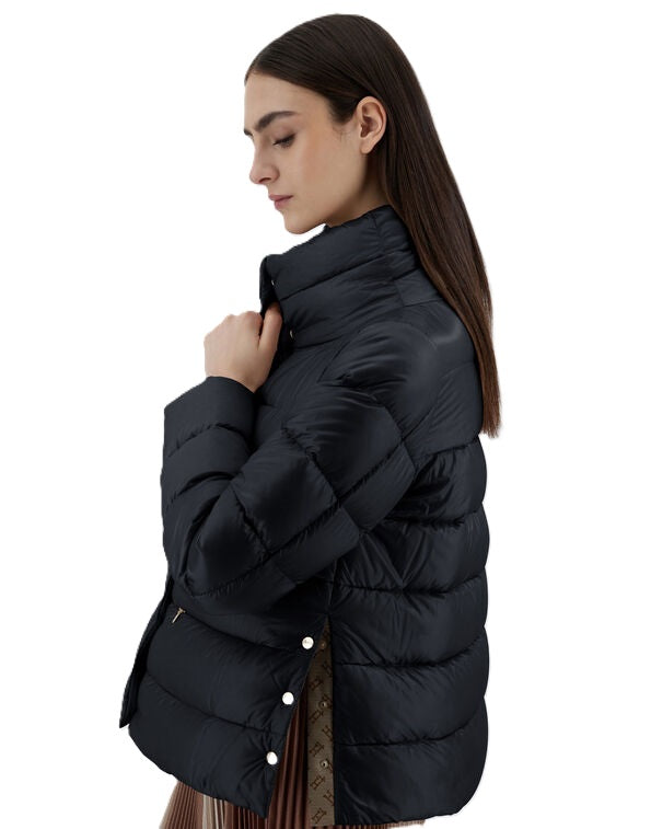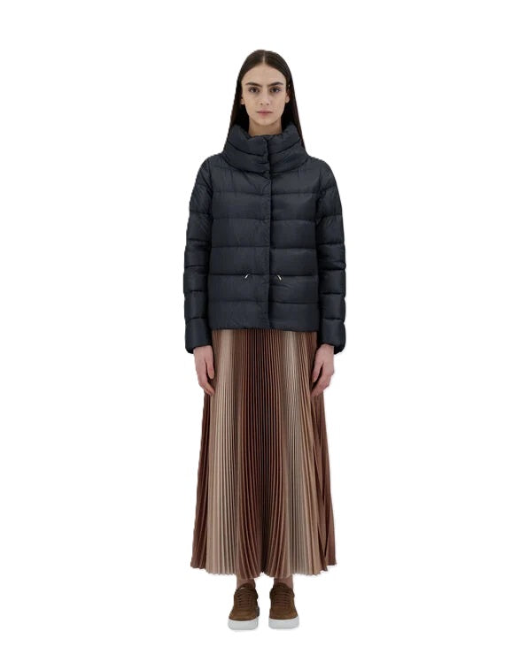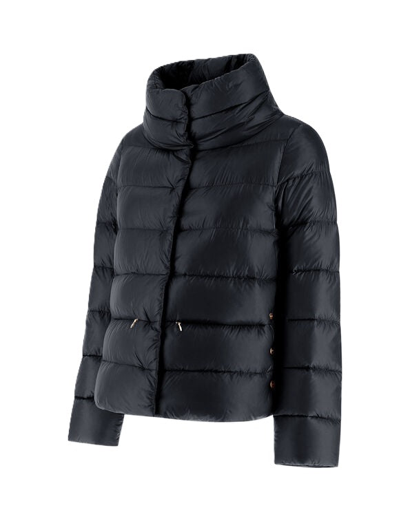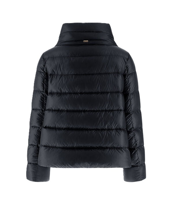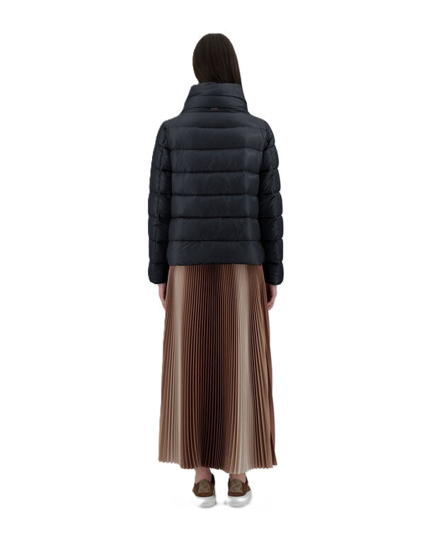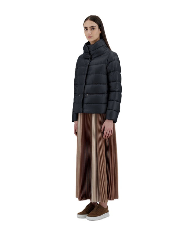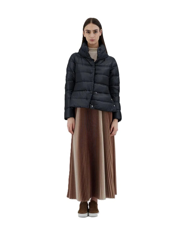 Jacke Herno Nylon Ultralight. Die super leichte Jacke von Herno zeichnet sich durch ihr tolles Design aus. Sie hat einen hohen Stehkragen und eine seidenähnliche Haptik. Die Jacke hat seitliche Knöpfe zum individuellen Verstellen. Sie hat einen verdeckten Knopfverschluss und eine Daunenwattierung. Ebenfalls hat sie hübsche Paspeltaschen mit Reißverschluss. Die Jacke kann man perfekt zu Kleidern, Röcken und Hosen stylen und hält im Winter schön warm. Sie fällt größengerecht aus.