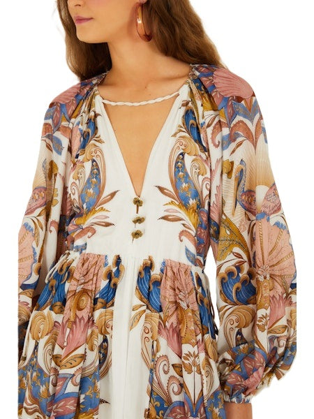 Kleid Farm Rio SEA GARDEN OFF-WHITE MINI BUBBLE DRESS. Wunderschönes Sommerkleid aus einem leichten und angenehmen Stoff. Das Kleid hat lange Ärmel mit Gummizug, so dass man die Ärmel schön hochschoppen kann. Das Kleid hat einen V-Ausschnitt, welcher mir einer Kordel verbunden ist. Die Taille hat einen Tunnelzug zum Verstellen und der Rock ist ballonförmig geschnitten. Hübsche Schmuckknöpfe auf der Vorderseite, ein kleiner Schlitz und Knopf auf der Rückseite. Das Kleid ist unterfüttert und fällt größengerecht aus. Es ist ein tolles Sommerkleid, mit Heels auch für einen besonderen Anlass.