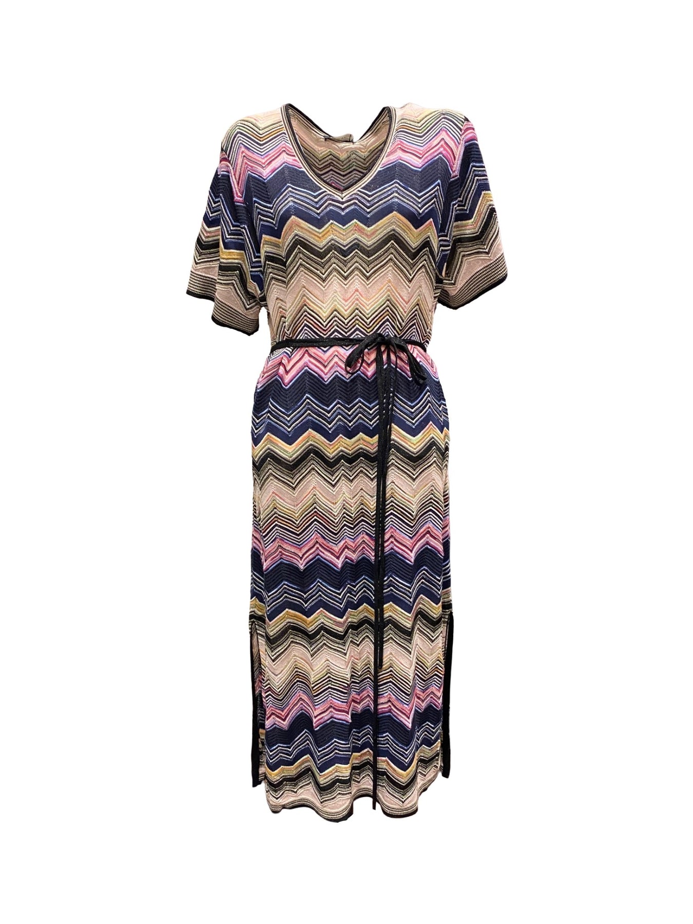 Kleid Oui. Dieses wunderschöne Kleid ist aus zartem Strick mit einem besonderen Missoni-Muster mit schimmernden Elementen. Es ist mittellang geschnitten, hat einen weiteren V-Ausschnitt und kurze Ärmel. Das herausnehmbare Taillenband verleiht dem Ganzen eine schöne Figur. Es hat unten seitlich zwei Schlitze und fällt der Größe gerecht aus. Das Kleid ist der perfekte Begleiter für Anlässe mit Stil.