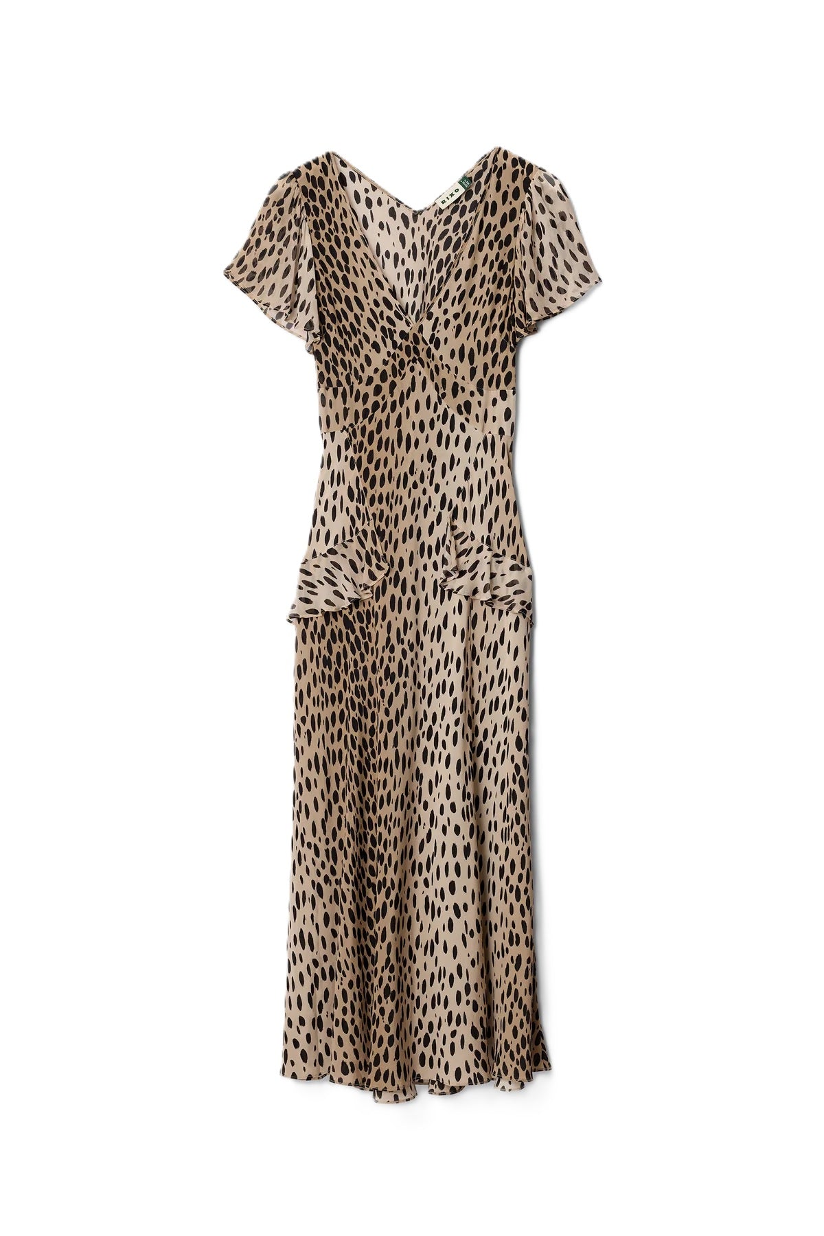 Kleid Rixo Evie. Das Kleid ist ein feminines Seidenkleid aus leichtem Crêpe de Chine. Das Modell besticht durch verspielte Georgette-Rüschen, einen BH-freundlichen V-Ausschnitt und ein verstellbares Taillenband, das die Figur sanft betont. Mit seiner Empire-Taille und dem charakteristischen Schrägschnitt fällt das Kleid unter der Brust leicht anliegend und ab der Taille locker und fließend. Die Midi-Länge und die gedeckten Farben im Antilopenmuster machen es zu einem vielseitigen Favoriten – perfekt für elegante Tages- oder Abendlooks.