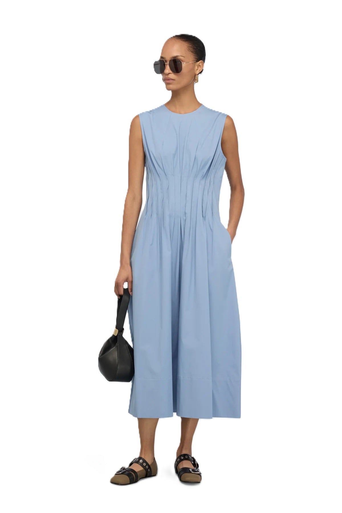 Kleid Semicouture ABITO MAYTE. Super schönes Sommerkleid ohne Ärmel. Das Kleid hat einen Rundhalsausschnitt und ist mittellang geschnitten. Es besteht aus Baumwolle und hat einen tollen Griff. Das Kleid hat feine figurbetonte Raffungen auf der Vorder-und Rückseite. Dies betont die Taille und schmeichelt der Figur. Ein Knopf auf der Rückseite zum Schließen und mehrere Zierknöpfe. Das Kleid hat seitliche Eingriffstaschen. Man kann es toll mit Sandalen für den täglichen Gebrauch tragen, oder mit Heels zu einem besonderen Anlass.