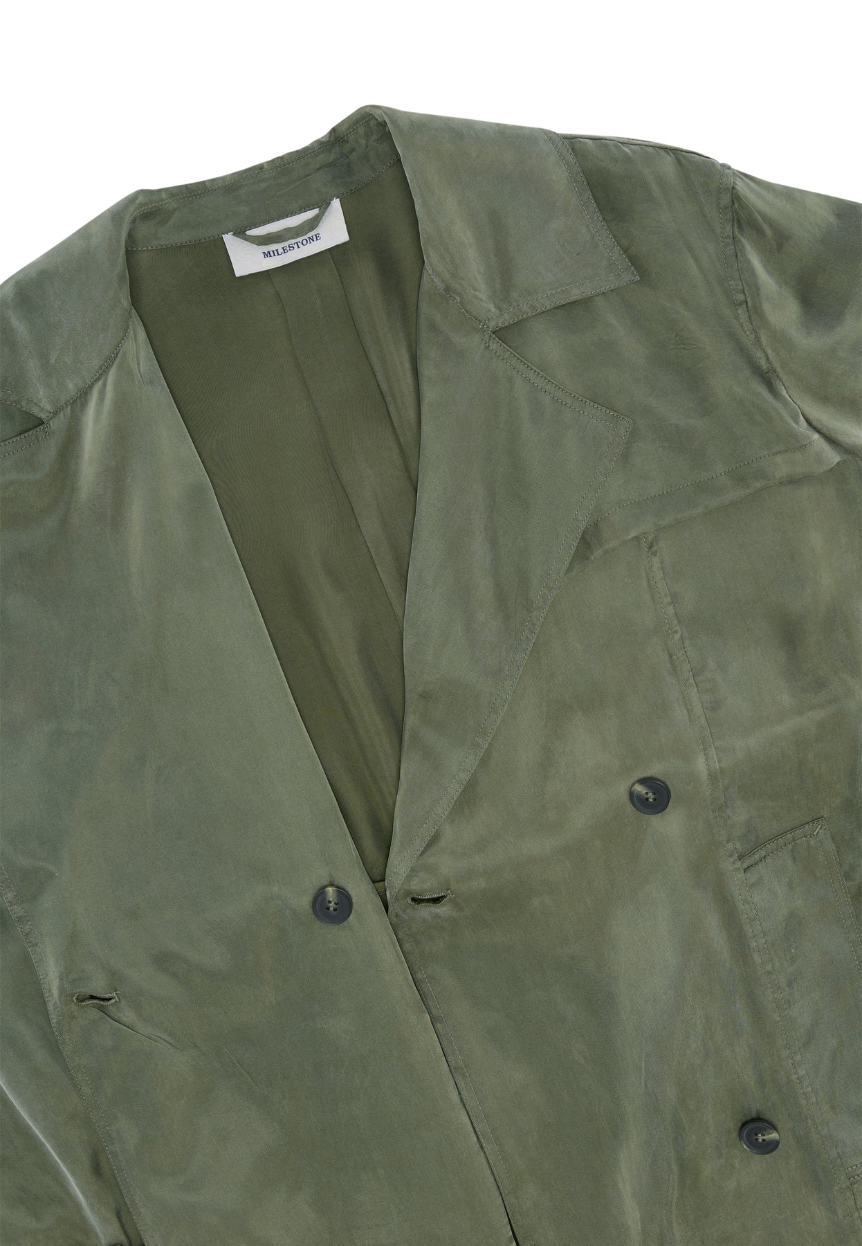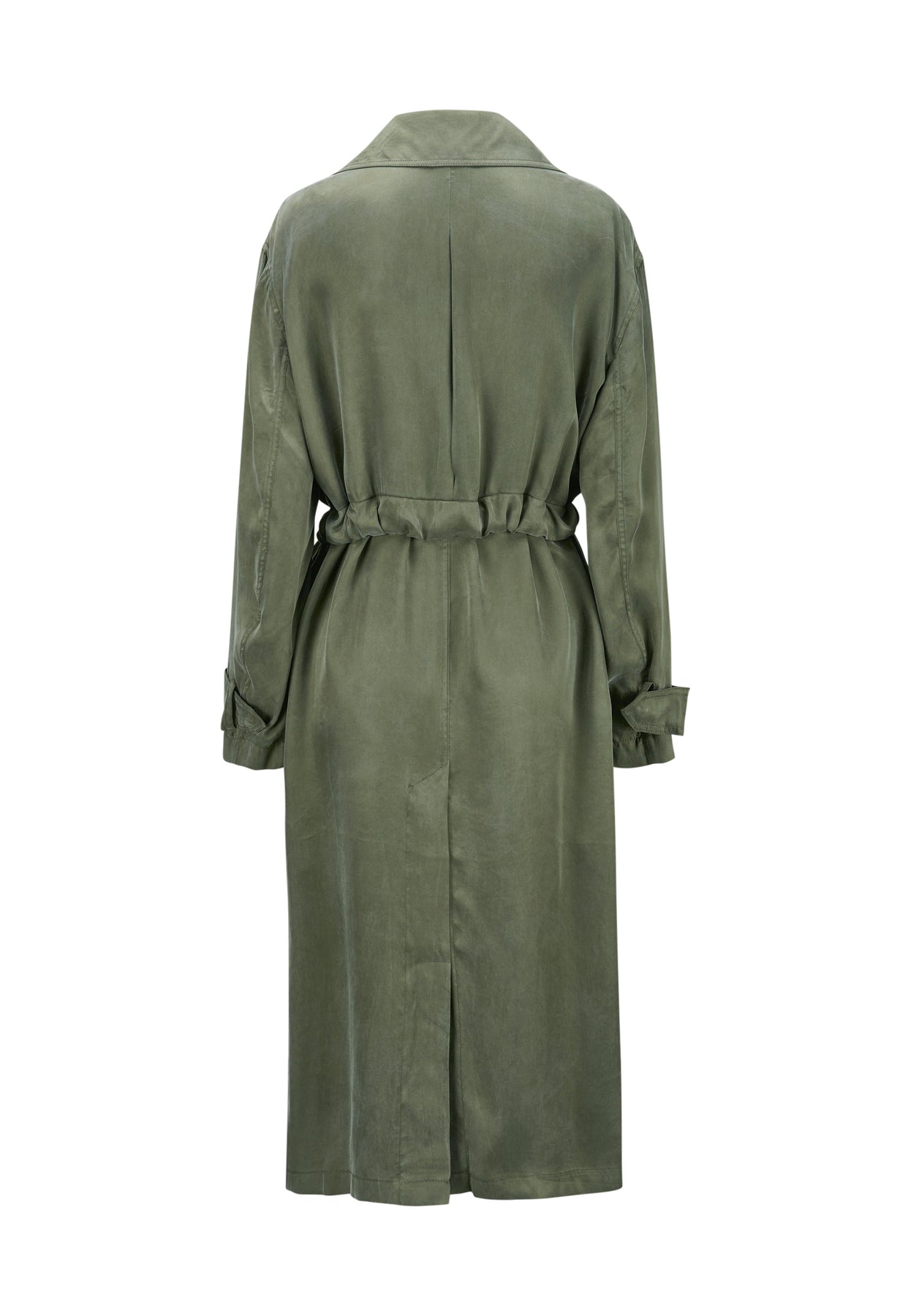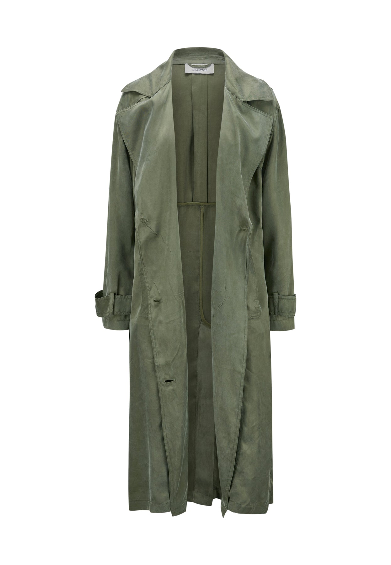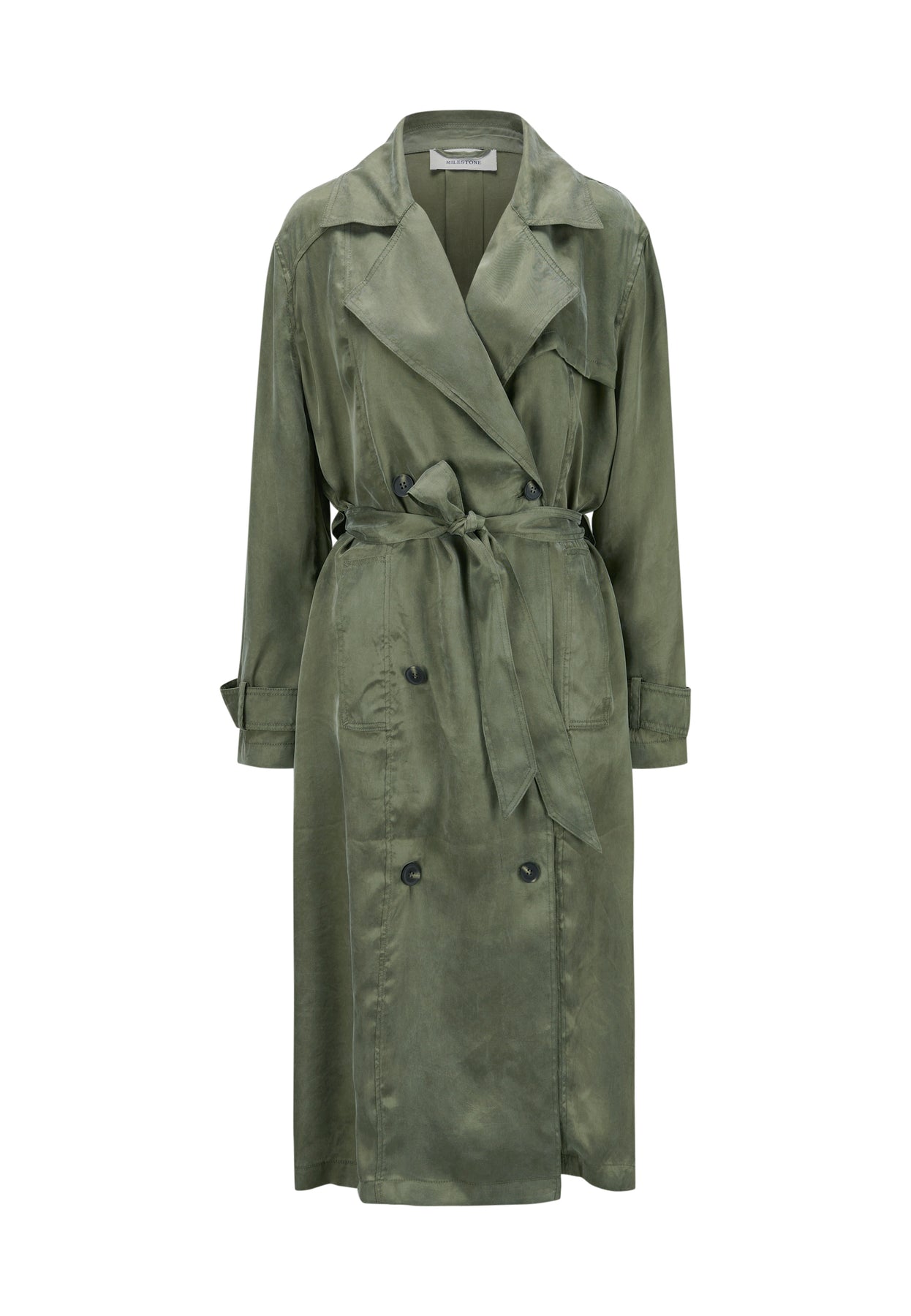 Mantel Milestone MSIzzy. Langer Trenchcoat aus fließender gewaschner Tencel-Viskose Ware. Der Mantel hat einen seidigen washed Look und ist 2-reihig mit Bindegürtel. Er hat ein Revers und sportive Doppelstepps. Der Mantel hat eine Kellerfalte und einen Tunnel für den Gürtel am Rücken. Die Ärmel haben breite Riegel, ebenfalls breite Leistentaschen an der Teilungsnaht und einen hohen Gehschlitz am Rücken. Der Mantel ist ungefüttert und trägt sich super angenehm. Er fällt größengerecht aus und sieht toll mit farbigen Oberteilen und Jeans zusammen aus.