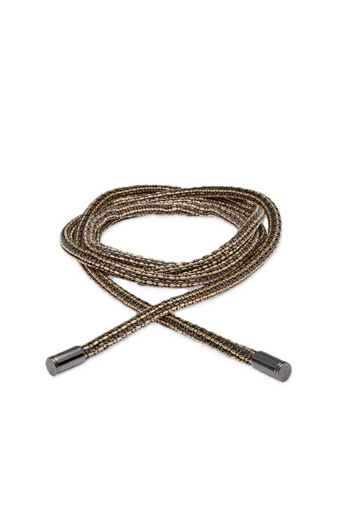 Gürtel Luisa Cerano. Ein langer, kordelähnlicher Gürtel, welcher durchgehend mit metallisch glänzenden Perlen besetzt ist. Die Enden sind mit metallischen Kappen verstärkt. Setze zauberhafte Perlenakzente und kreiere besondere Looks mit dem wunderschönen Gürtel von Luisa Cerano.