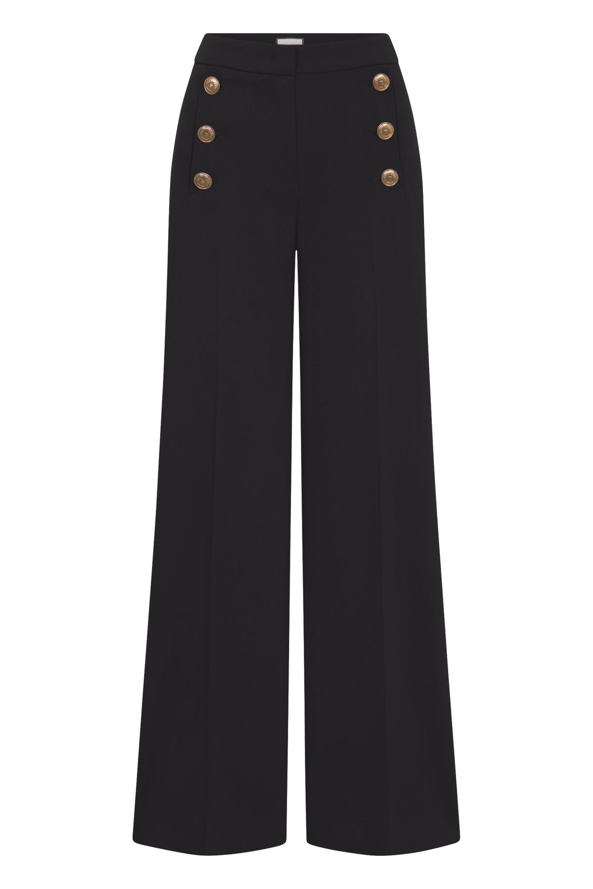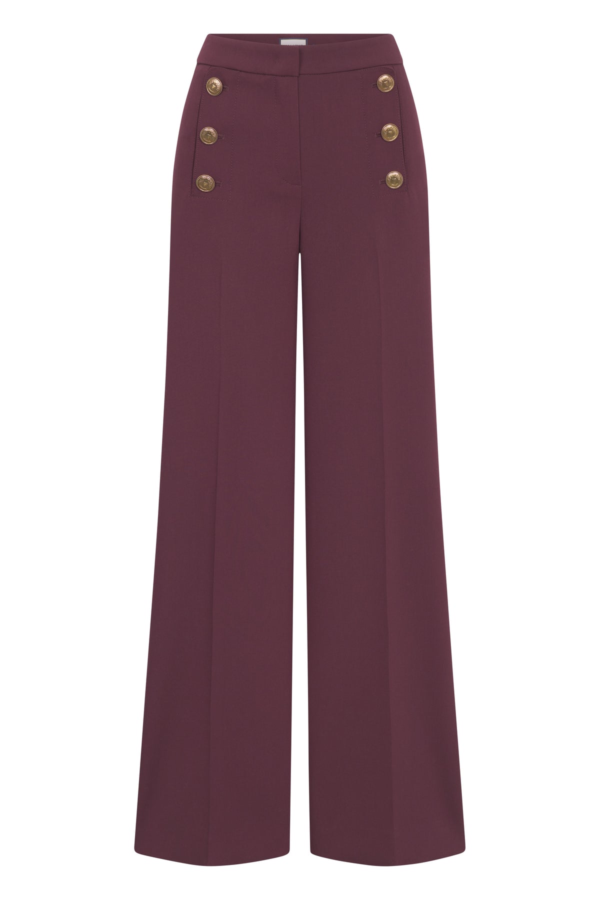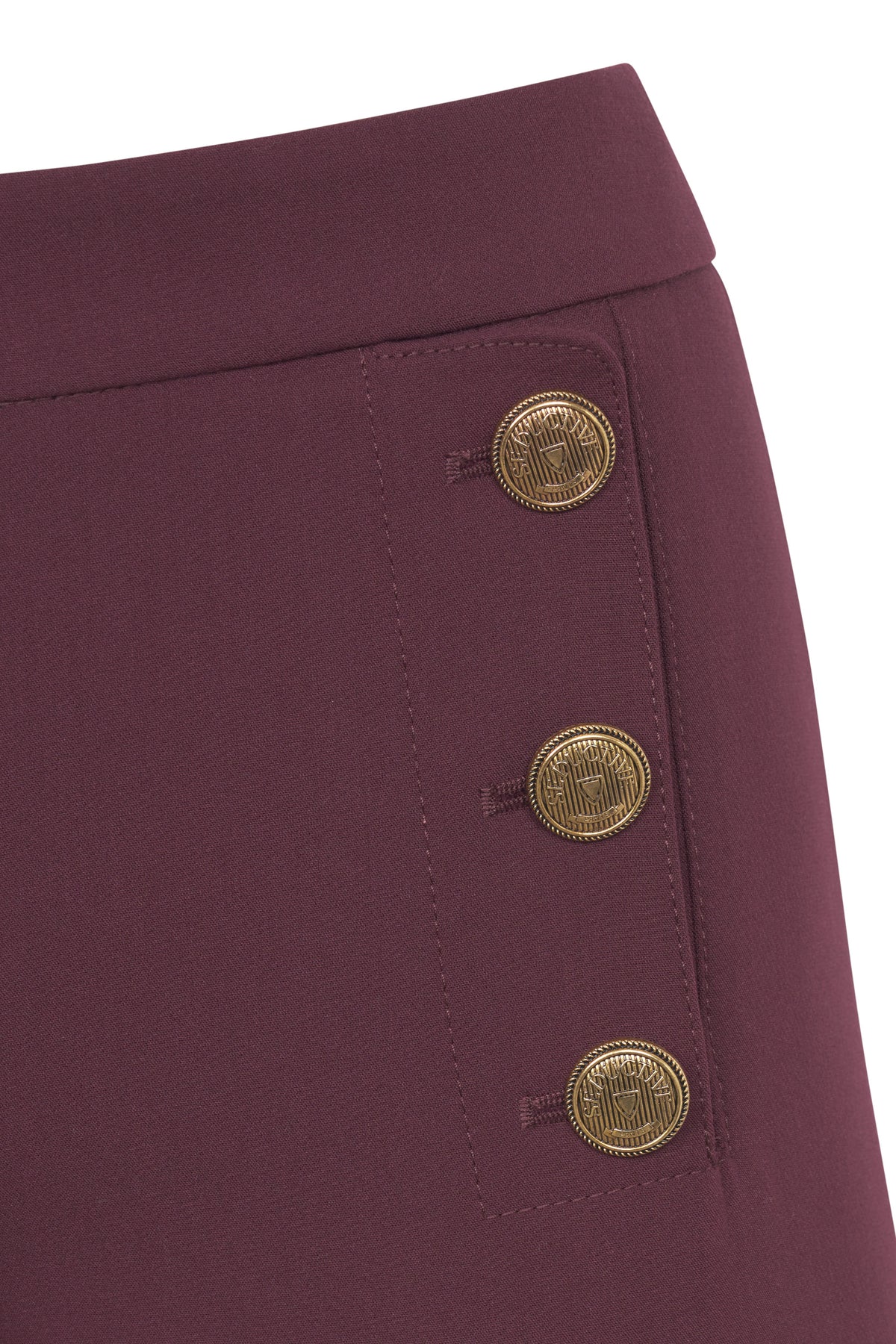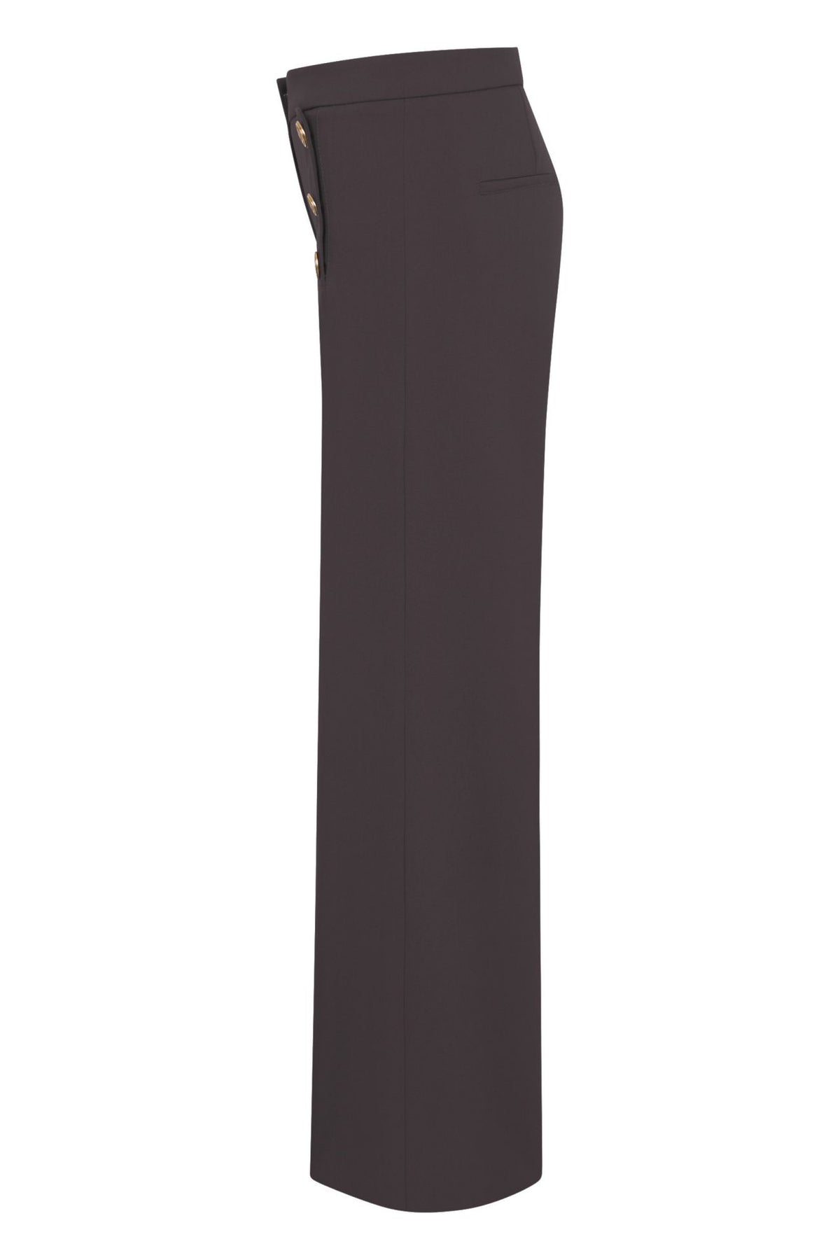 Hose Seductive Bridget. Diese superschicke Hose hat goldene Knopfleisten, die ihr einen eleganten Touch verleihen. Sie hat ein langes, weites Bein und eine mittlere Leibhöhe. Auf der Rückseite sind zwei Leistentaschen. Da die Hose sich elastisch und weich anfühlt, kann man sie als Alltags-Look, sowie für einen Business- Look stylen.