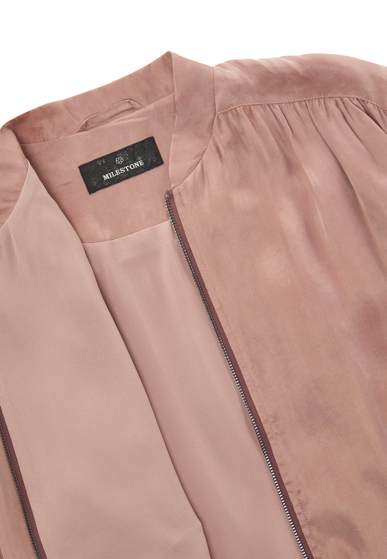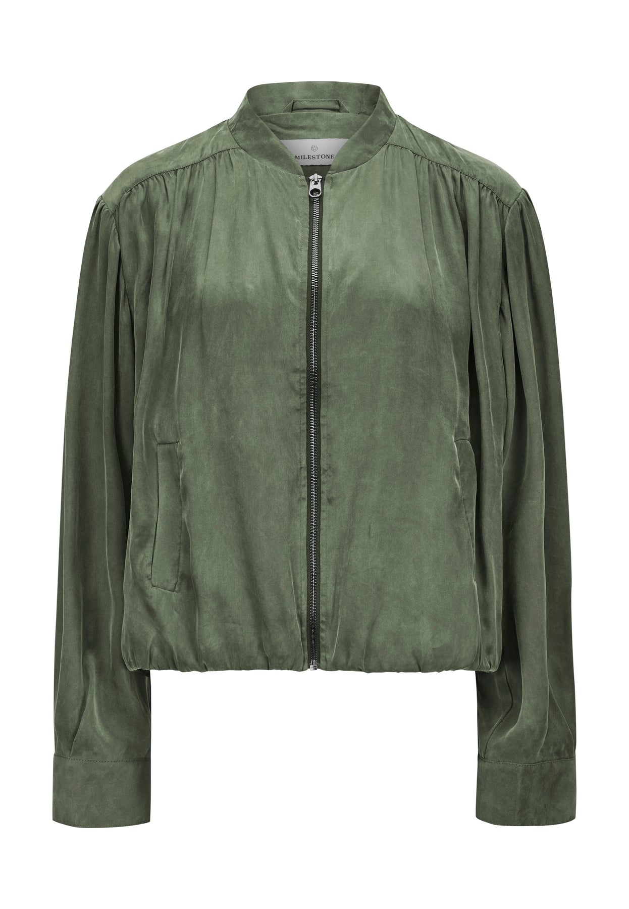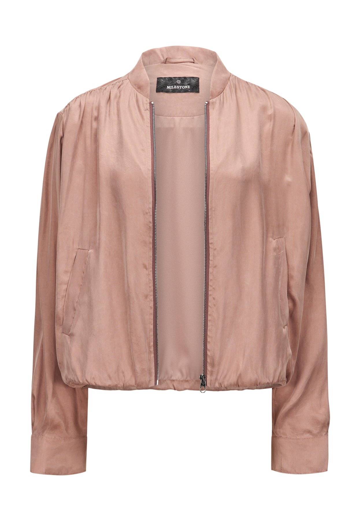 Jacke Milestone MSVamp. Kurzer Blouson aus fließender gewaschener Tencel-Viskose Ware. Der Blouson hat einen seidigen washed Look. Der Blouson hat einen innenliegenden Tunnelzug zum Verstellen mit elastischer Kordel. Er hat einen Collegekragen. Kräuselungen in Armloch, Vorderteil und Schulterpasse heben den seidigen Charakter der Ware hervor. Der Blouson hat Leistentaschen. 1-Wege-Metall-Reißverschluss in der vorderen Mitte lassen den Look sportiv aussehen. Der Blouson ist gefüttert. Die Farbe sieht besonders hübsch zu weiß aus. Der Blouson fällt größengerecht aus.