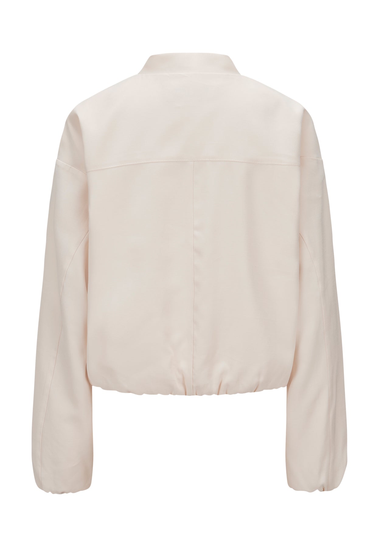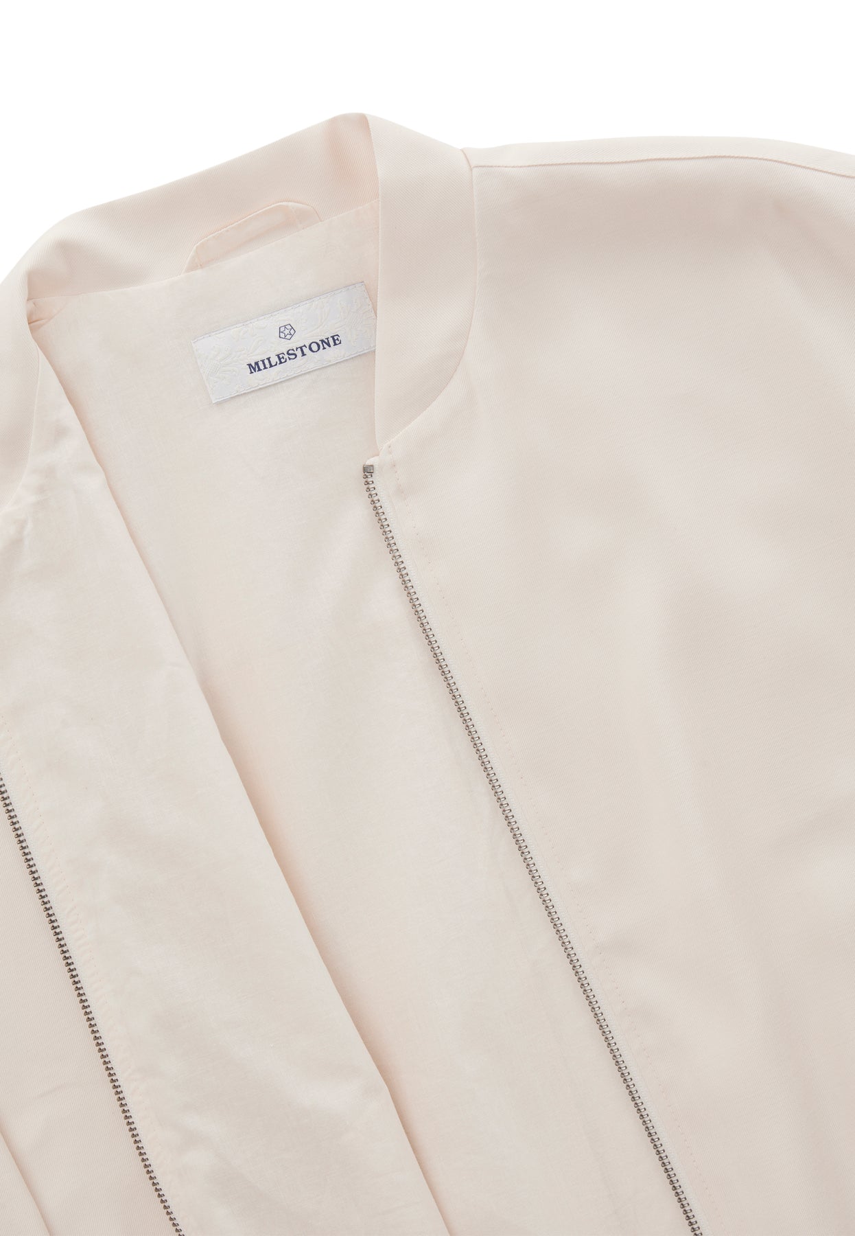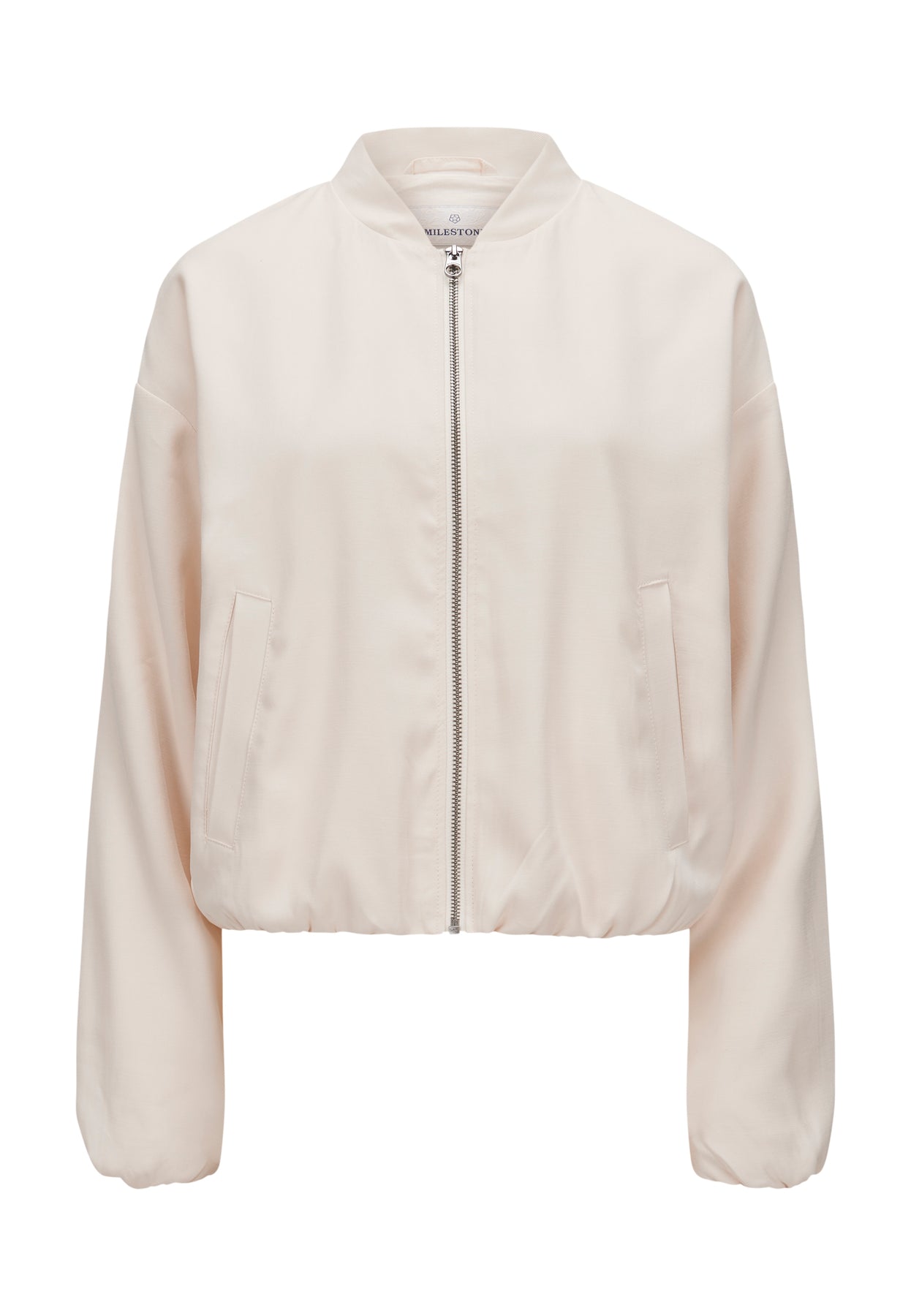 Jacke Milestone MSYuki. Kurzer Blouson aus fließender Viscose-Polyester-Mischung. Lässige Passform mit leicht überschnittenen Schultern. Der Blouson hat einen Collegekragen. Innenliegende elastische Gummiband in Saum und Ärmelsaum unterstreichen den Blousoncharakter. 1-Wege Metall-Reißverschluss in der vorderen Mitte. Der Blouson hat Leistentaschen. Er fällt größengerecht aus und ist mit allen Styles kombinierbar.