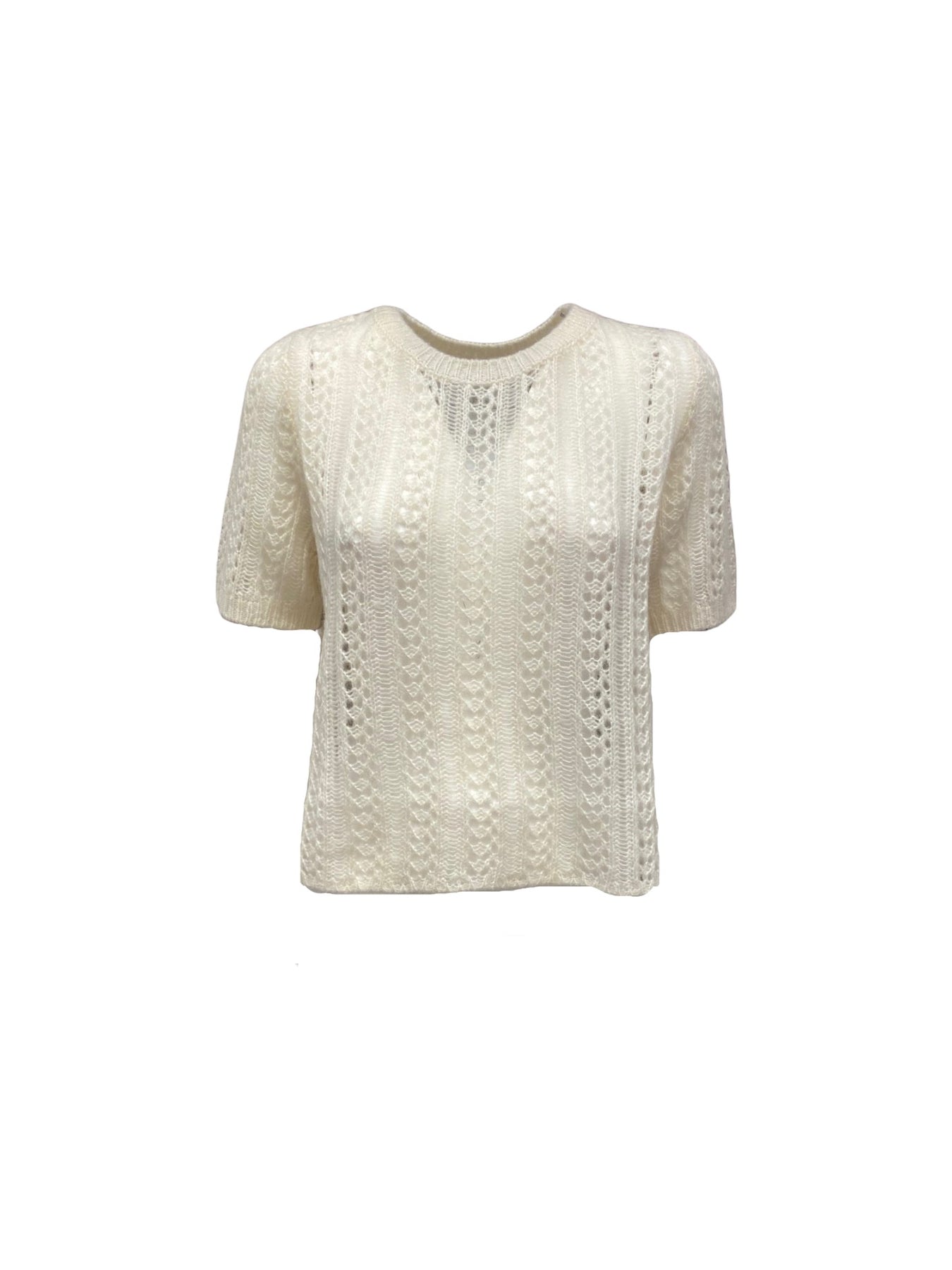 Pullover LU REN SAKURA. Dieses Strickoberteil begeistert mit einem weichen Kaschmir-Seide-Mix und einem feinen, leicht transparenten Ajour-Strickmuster, das dem Design eine besondere Leichtigkeit verleiht. Der klassische Rundhalsausschnitt und die kurzen Ärmel unterstreichen den modernen Look, während der cropped Schnitt für eine trendige Silhouette sorgt. Es fällt der Größe gerecht aus und ist ein leichtes und stilvolles Strickteil, das perfekt für die kommende Saison geeignet ist.