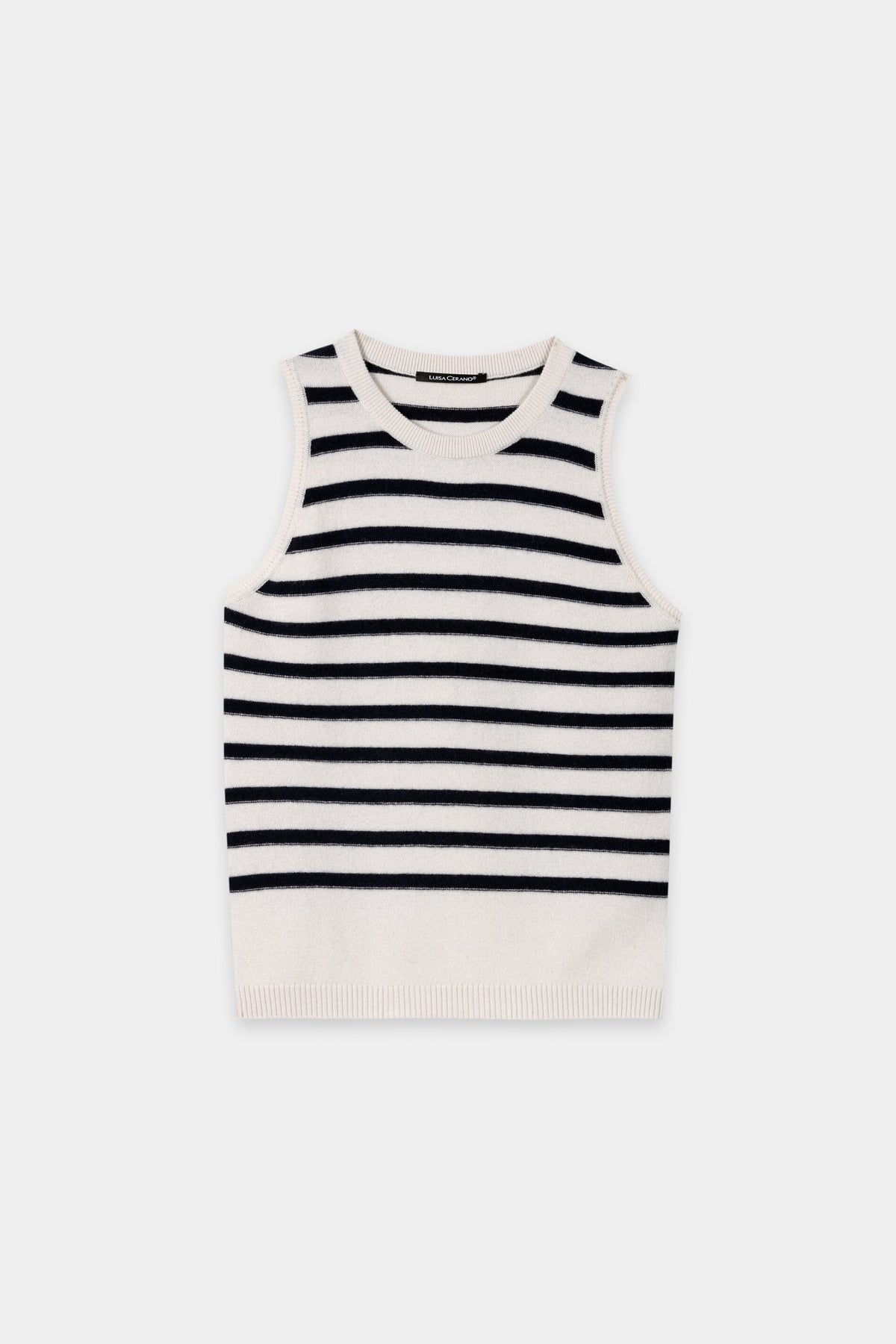 Top Luisa Cerano. Gestreiftes Top aus Cashmeremix ohne Ärmel. Das Top hat einen Rundhalsausschnitt und American Shoulders. Die Abschlüsse haben Rippstrickbündchen. Das Top sieht super einzeln zur Jeans aus, wir haben aber auch die passende Strickjacke dazu, so dass es wie ein Twinset aussieht. Das Top fällt größengerecht aus.