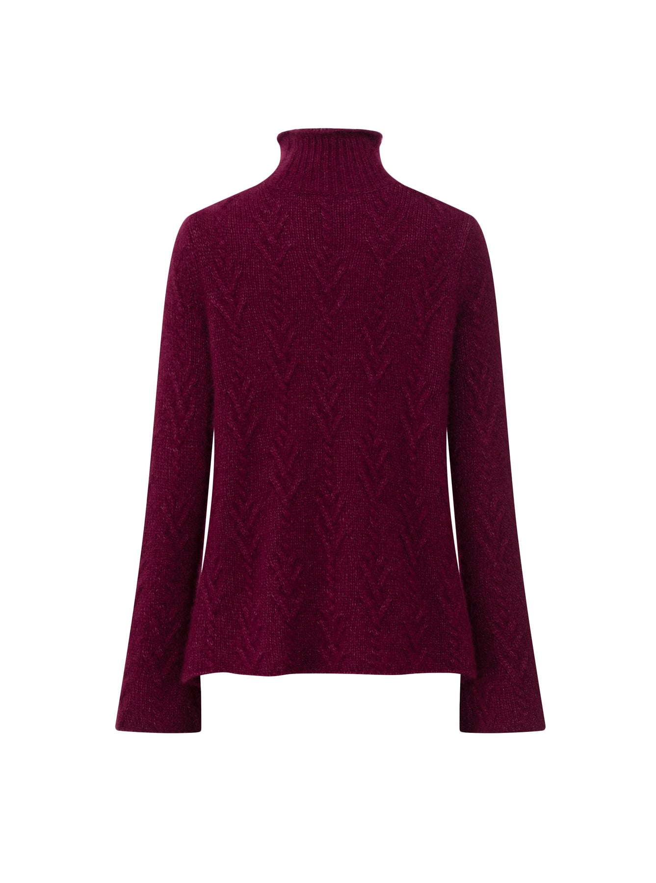 Pulli LU REN EASTON. Der klassische Pulli von LU REN ist aus einem Cashmere-Seiden-Mix. Der Pulli hat ein einzigartiges Zopfmuster und er hat tolle Trompetenärmel. Er hat auch einen Stehkragen. Der Pullover hat ein sehr hübsches feminines Schößchen. Er fällt größengerecht aus. Man kann ihn vielseitig kombinieren, egal ob mit einem schmalen Rock oder eine schmalen Hose.