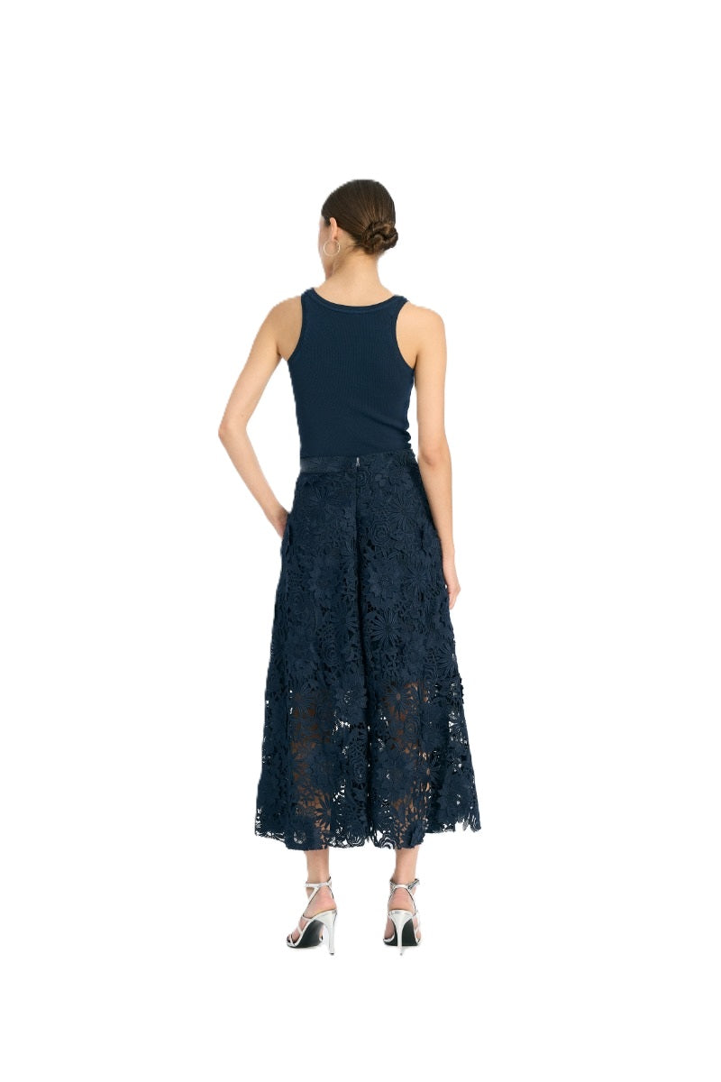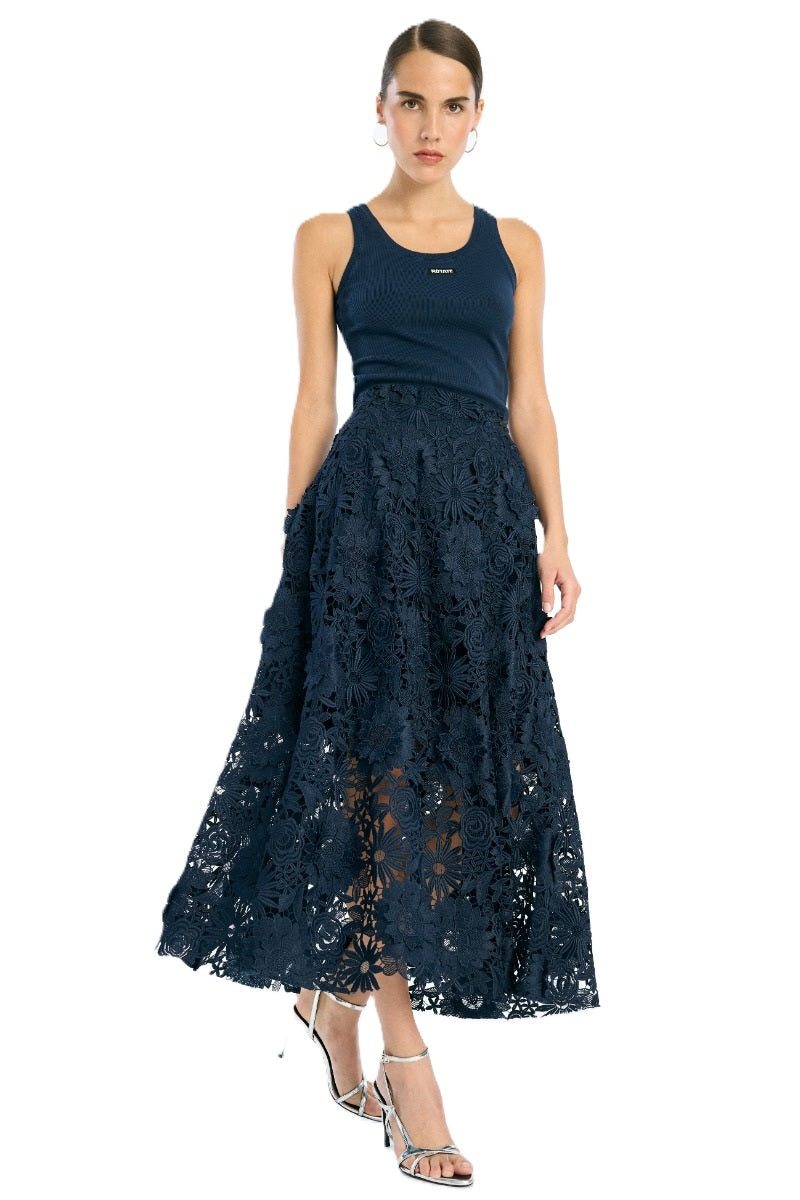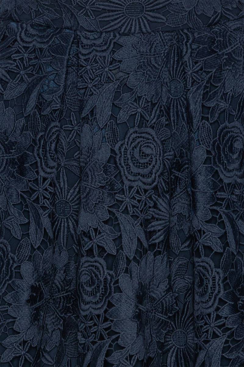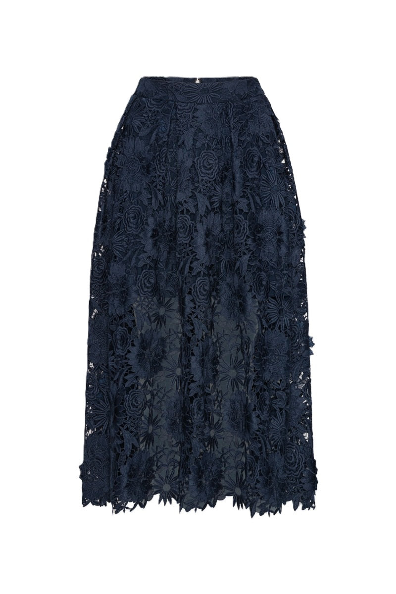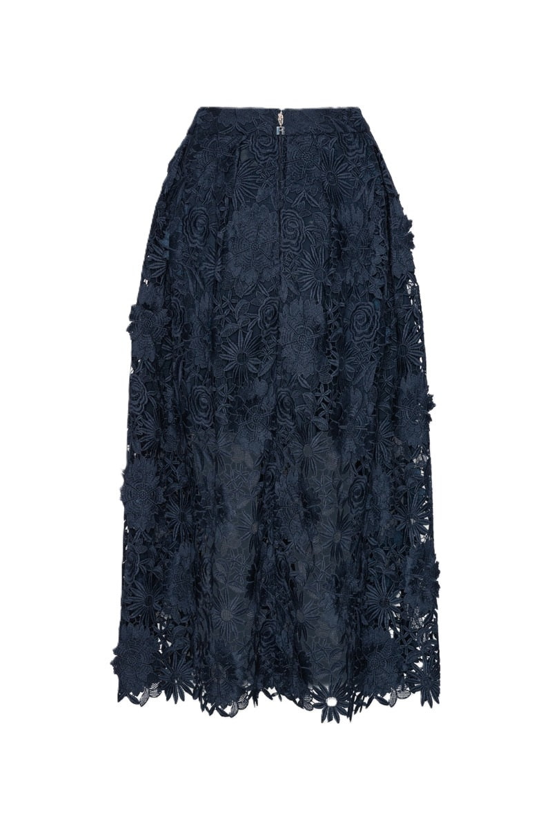 Rock Rotate. Der dunkelblaue 3D-Spitzen-Midirock ist aus floraler Spitze mit leicht transparentem Effekt gefertigt. Er hat einen figurbetonten Bund, eine gerade Midi-Länge und einen Reißverschluss hinten. Das detaillierte Spitzenmuster sorgt für eine interessante Textur. Der Rock ist gefüttert und fällt größengerecht aus. Man kann ihn zu lässigen, aber auch eleganten Looks stylen.