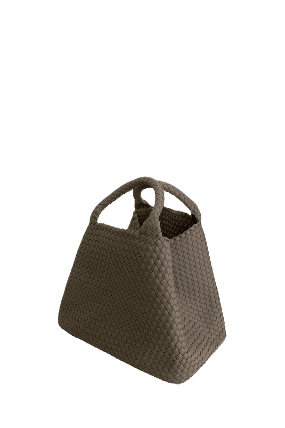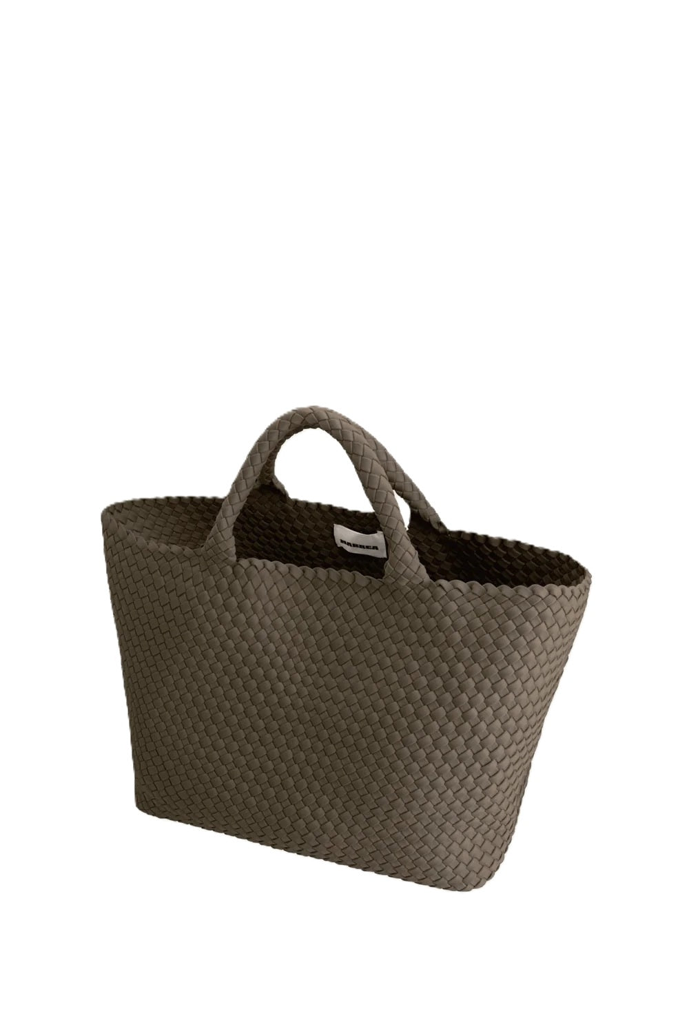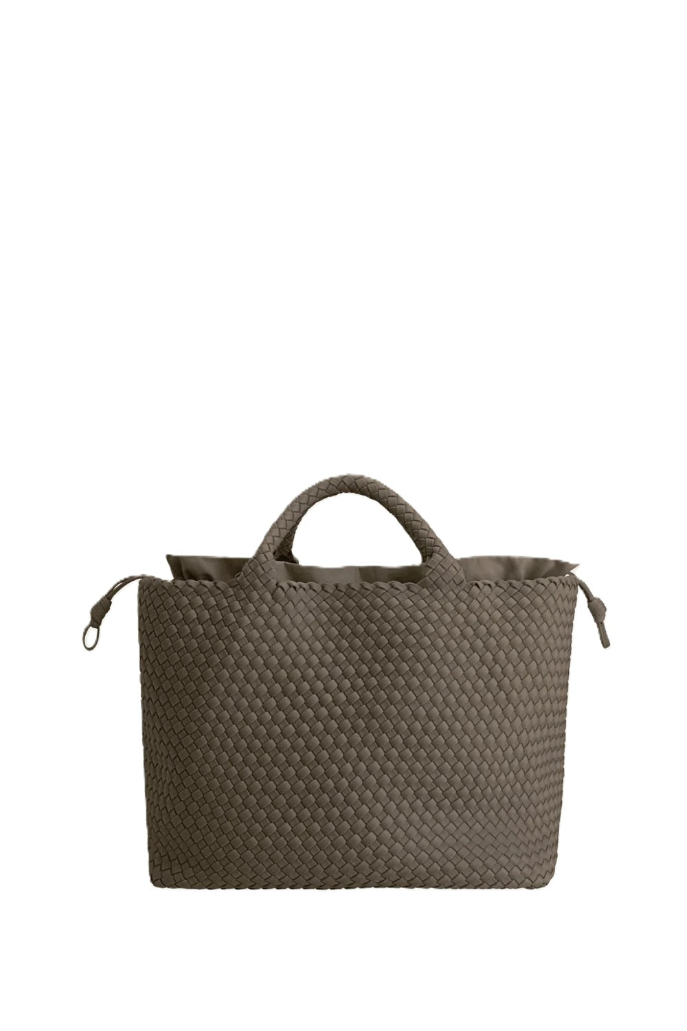 Tasche Marrea Large Coco Fresco. Wunderschön gewebte Tasche aus Neopren in grünem Khaki. Die Tasche hat zwei Tragegriffe und goldfarbene Hardware. Sie schließt mit einem Hakenverschluss. Ob im Fitnessstudio, am Strand oder für einen Wochenendtrip – die extra große, geräumige Tasche ist der perfekte Begleiter für alle Gelegenheiten.